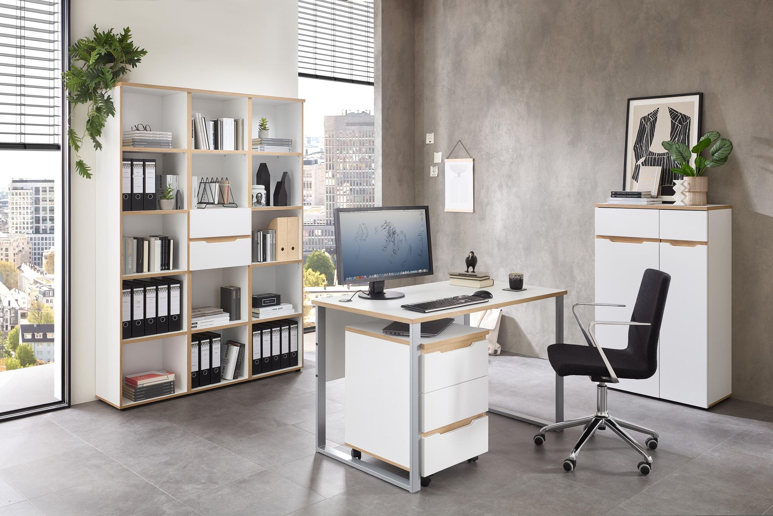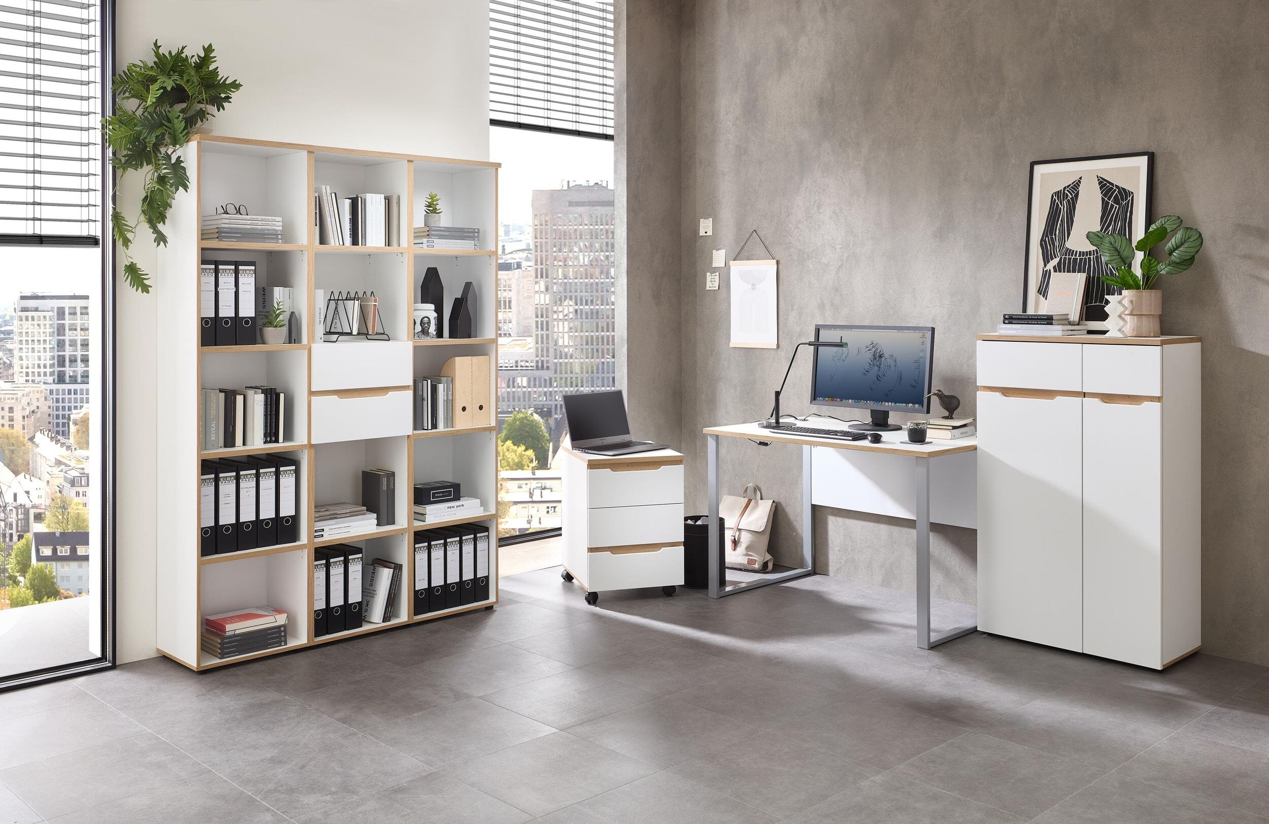 Die Serie Memphis steht für innovatives und durchdachtes Design. Das zeitlose Weiß Melamin der Tischplatte harmoniert perfekt mit dem silbernen Gestell. Besonderes Highlight: Die Kanten und Absetzungen in Artisan Eiche Nachbildung verleihen dem kühlen, modernen Look eine warme, wohnliche Note.