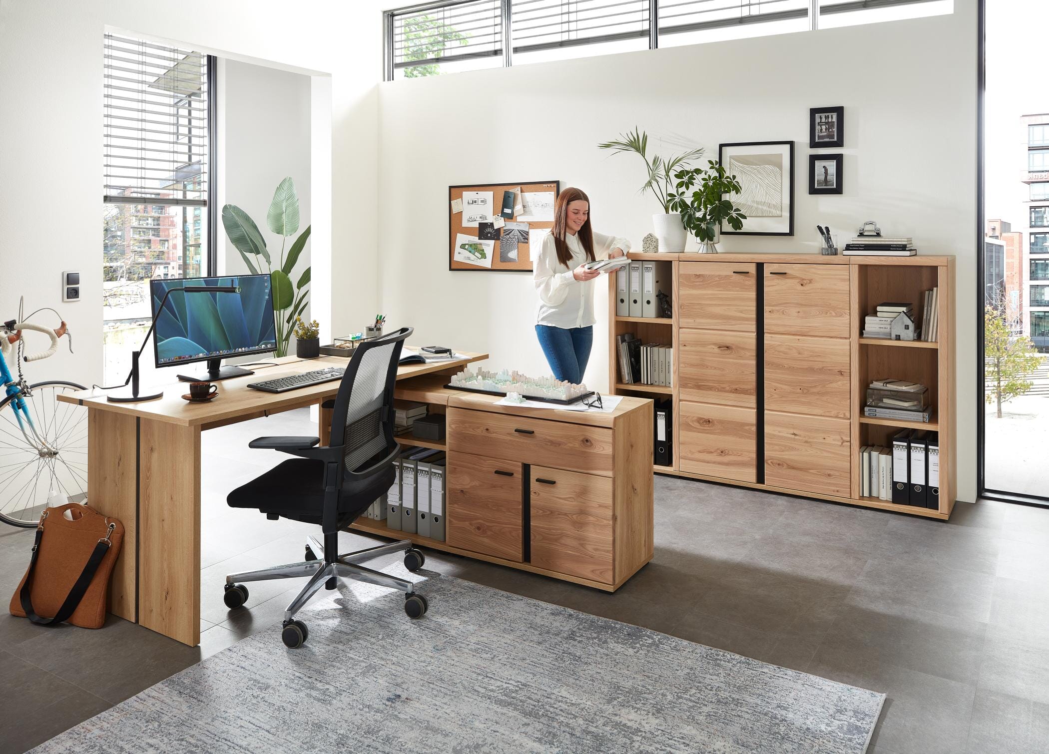 Der Schreibtisch kann durch ein Eckelement oder Unterbauregale erweitert werden, auch ein Rollcontainer ist als Zubehör bestellbar