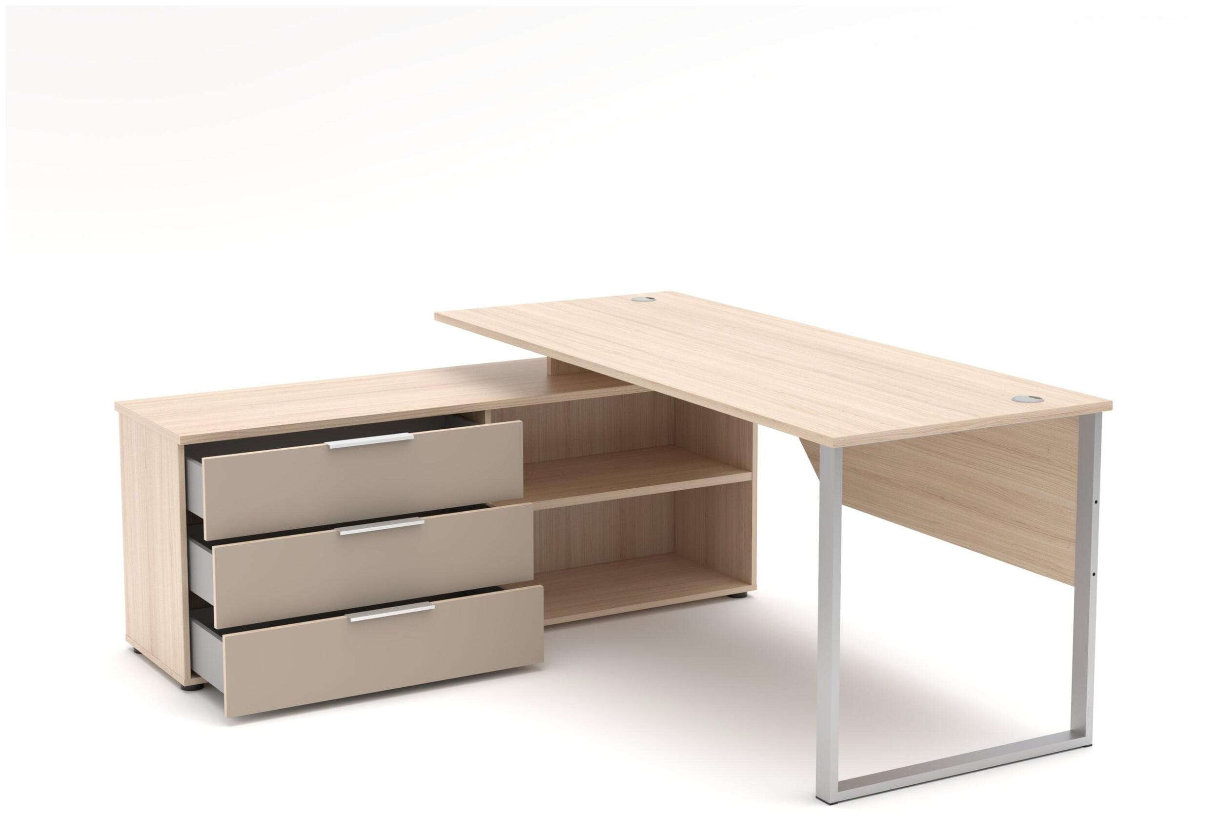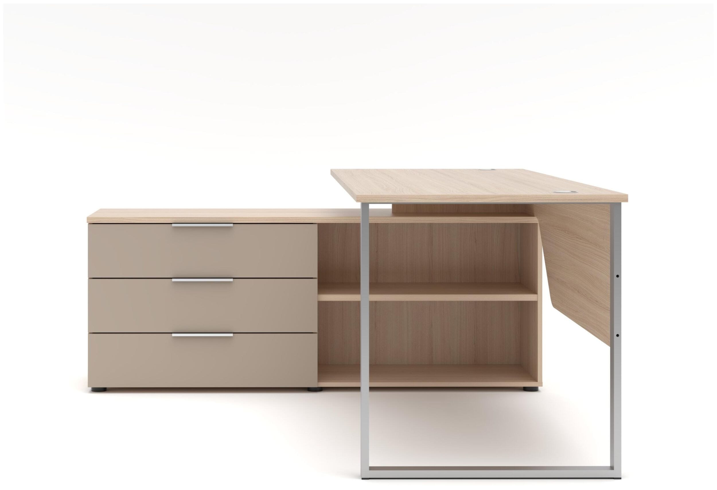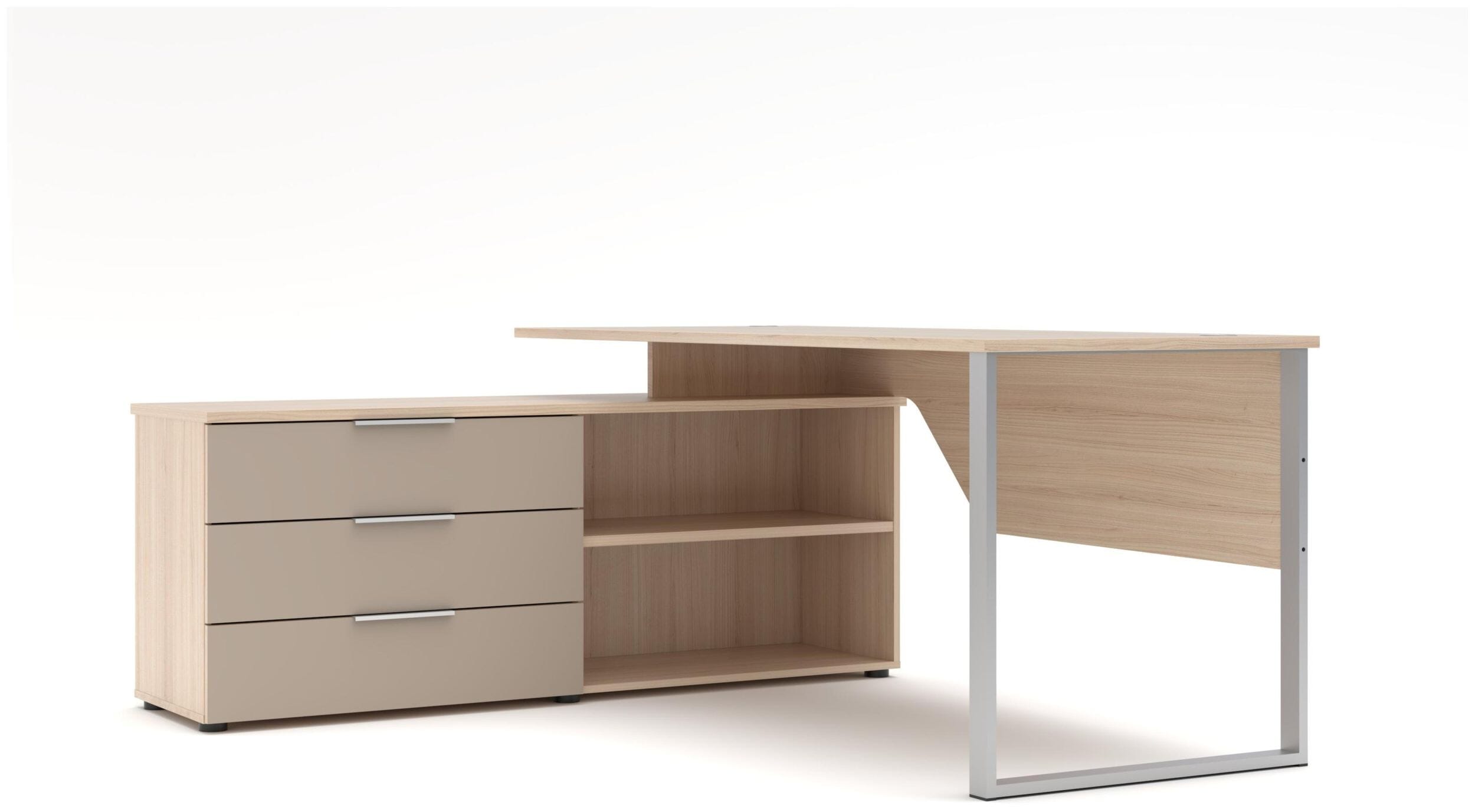 Der Eckschreibtisch der Serie Santorin ist die perfekte Lösung für alle, die Design und Funktionalität an ihrem Arbeitsplatz vereinen möchten. Mit einer großzügigen Arbeitsfläche von 180 cm Breite und dem integrierten Winkel-Element bietet dieser Schreibtisch maximalen Raum für kreatives Arbeiten und effiziente Organisation. Die edle Kombination aus natürlicher Riva Eiche und den sanften Glasfronten in Cashmere schafft eine inspirierende Atmosphäre in jedem Büro oder Home-Office.