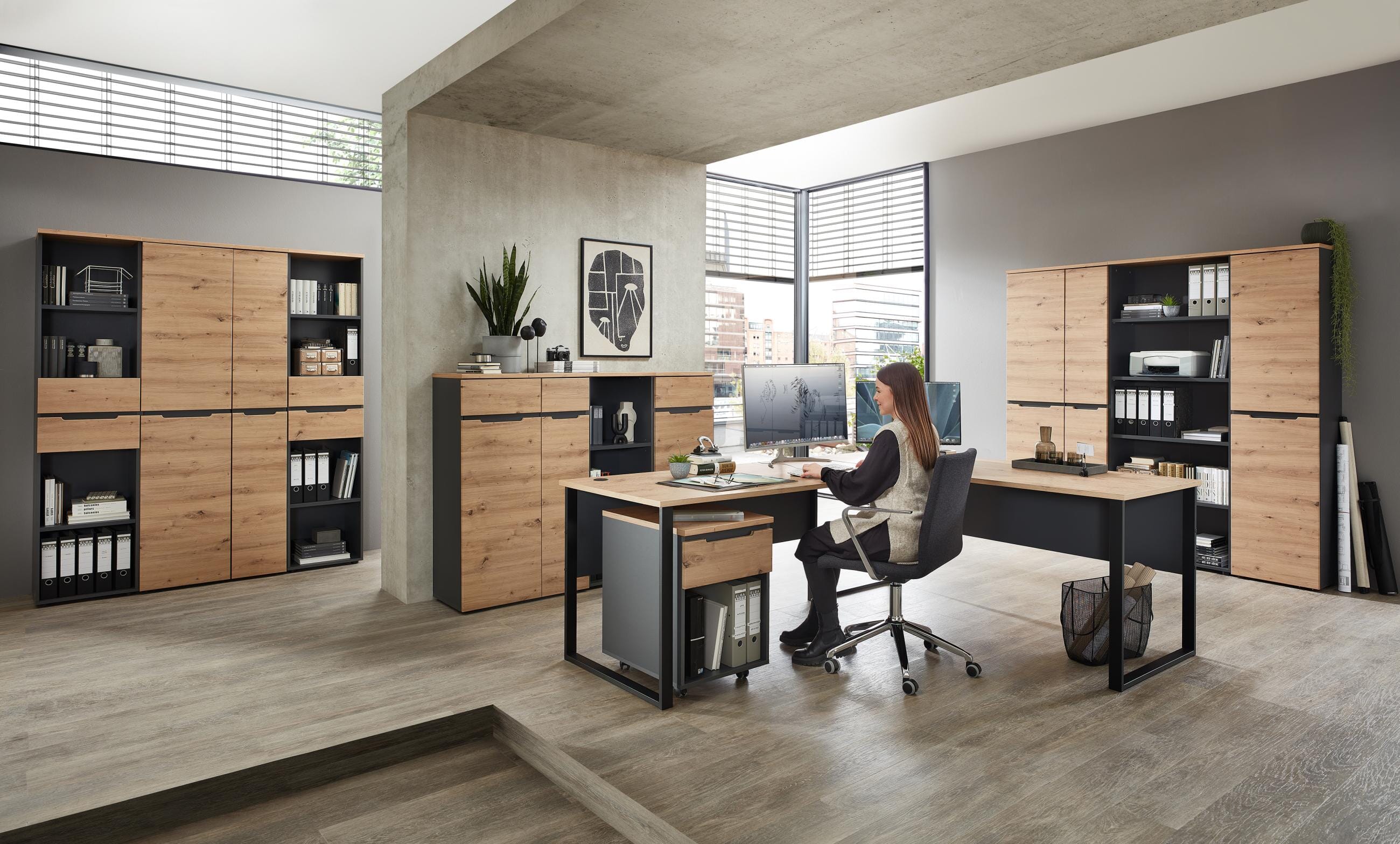 Das Büroregal MEMPHIS mit Oberboden in Artisan Eiche Nachbildung und Korpus in Graphit ist ein absolutes Highlight für Ihr Büro, die Farbgebung wirkt modern und natürlich zugleich.