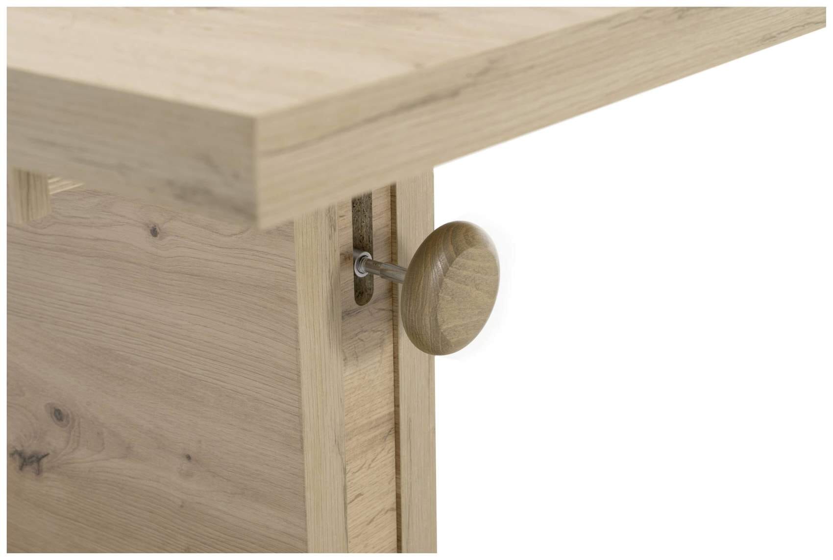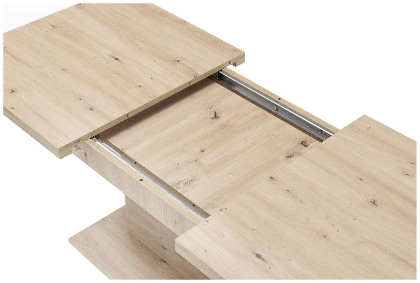 Als Material kommt ein beschichteter Plattenwerkstoff zum Einsatz. Veredelt wurde das Modell mit einer robusten Beschichtung in Artisan Eiche Nachbildung, das freundlich und natürlich wirkt. Ein besonderer Gag ist die Tischverbreiterung. Wenn sie nicht benutzt wird, lässt sich der 40 cm breite Einleger des Tisches ganz leicht unter der eigentlichen Platte verstauen.