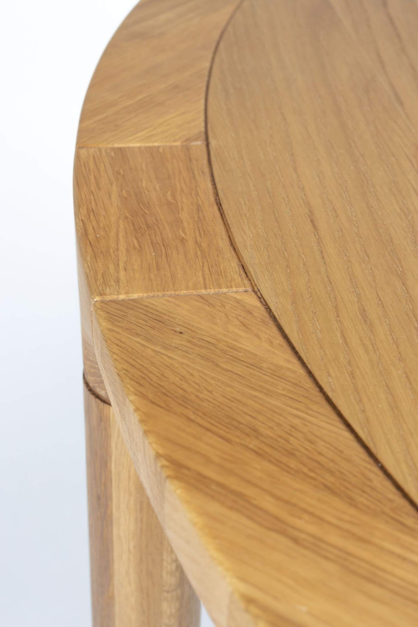 Das Material, Eiche, natur lackiert, wirkt nicht nur edel, es ist auch edel. Der Rand und die Beine bestehen aus massiver Esche. Das wirkt keineswegs trutzig, sondern wunderbar anmutig. Die Art, wie die Kanten ineinander greifen, das Holz mit seinen Maserungen - dieser Tisch ist ein Traum gewordenes Stück Natur für den Wohnbereich.