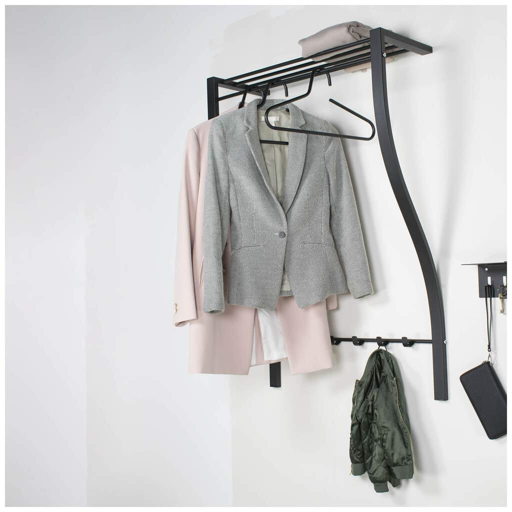 Kantiger Stahl und geschwungene Formen: Die Wandgarderobe Carve überzeugt mit Stil und Funktionalität. Die klare Struktur in klassischem Schwarz passt besonders gut zu modernen und minimalistischen Einrichtungsstilen.