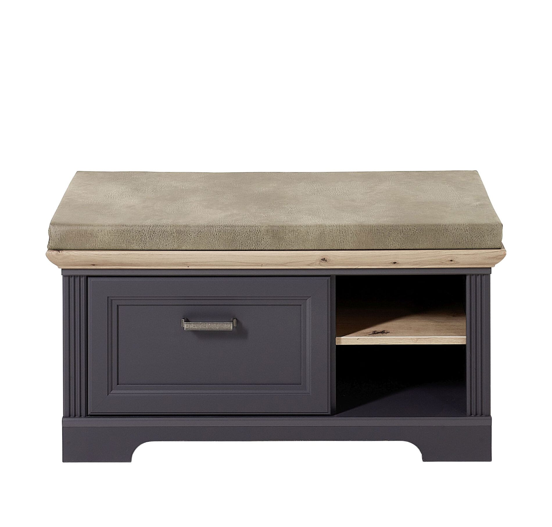 Ausgesprochen gelungen sind die in traditionsreicher Kassettentechnik gestalteten Fronten des Möbelstücks sowie der sanft geschwungene Boden. Den Schubkasten auf der linken Seite der Dielenbank öffnen Sie mit einem in antiker Optik gestalteten Metallgriff. Dabei öffnet und schließt der Schubkasten dank der integrierten Soft-Close-Automatik angenehm leise.