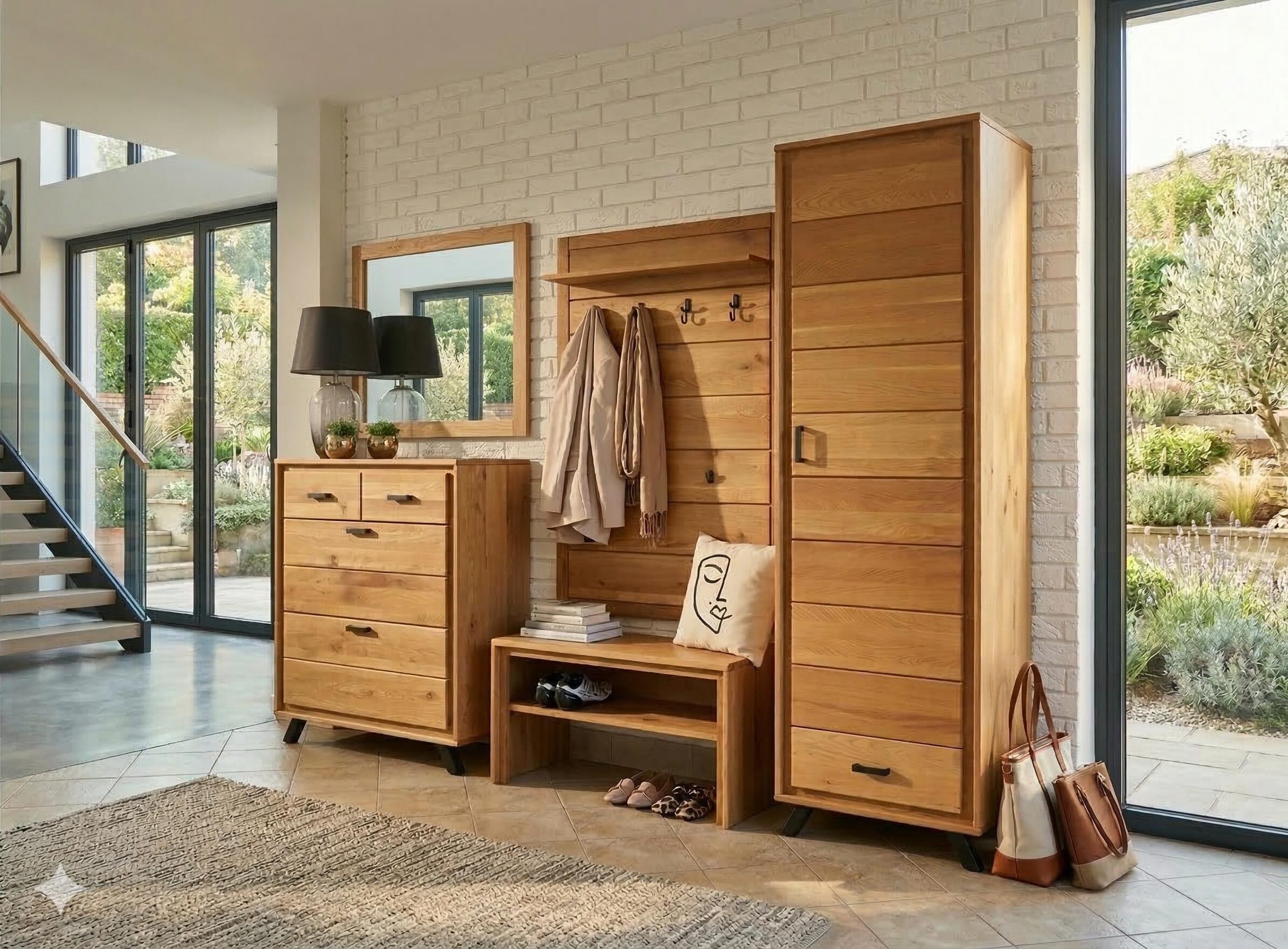 Das Garderoben Set Genf I besteht aus einem Schuhschrank, einem Dielenschrank, einem Garderobenpaneel, einer funktionellen Garderobenbank und einem rechteckigen Spiegel. Alle Möbel werden aus geöltem und gewachstem Wildeiche Massivholz mit durchgehenden Lamellen hergestellt und begeistern mit einer sehr guten Qualität.