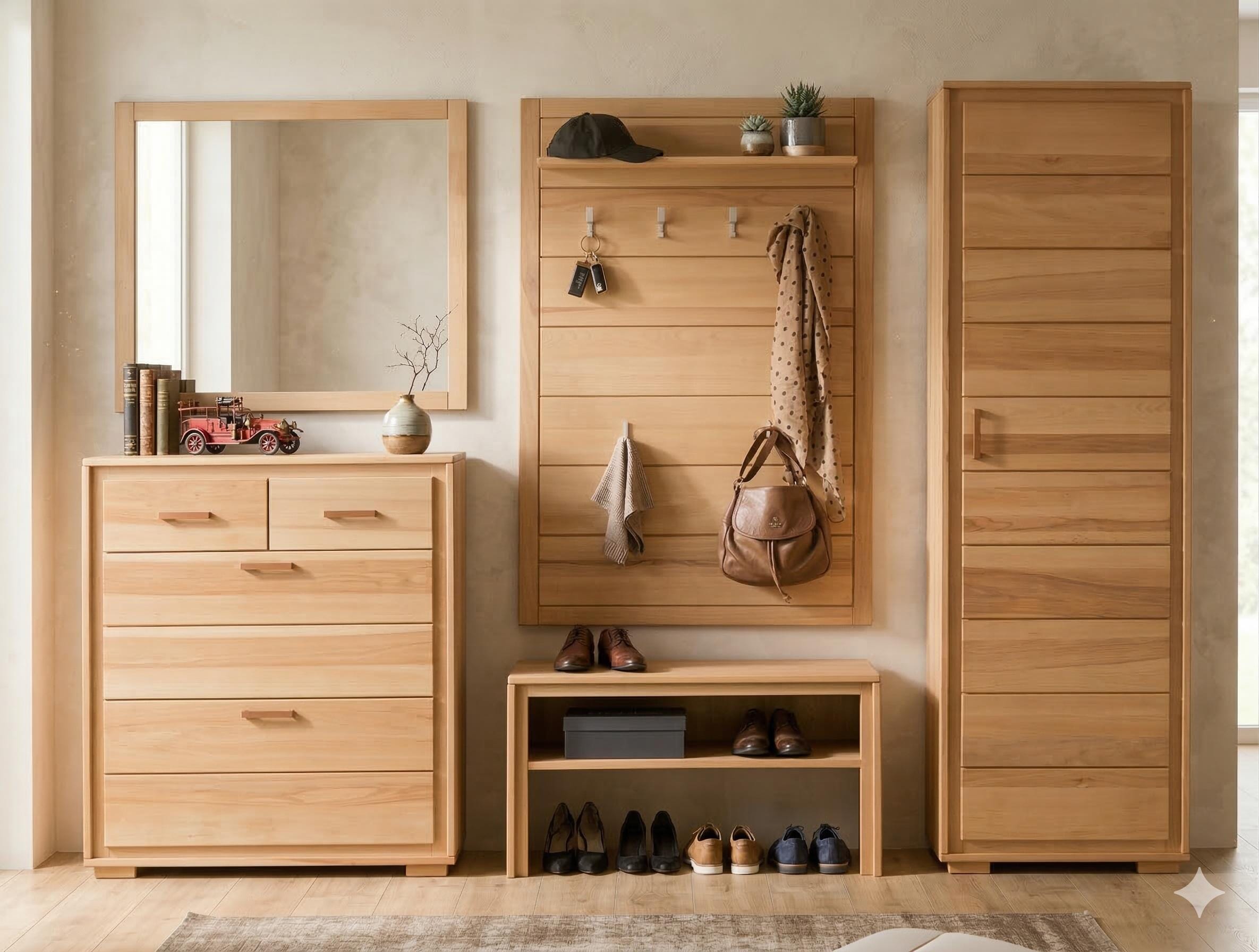 Das Garderoben Set Genf I besteht aus einem Schuhschrank, einem Dielenschrank, einem Garderobenpaneel, einer funktionellen Garderobenbank und einem rechteckigen Spiegel. Alle Möbel werden aus geöltem und gewachstem Kernbuche Massivholz mit durchgehenden Lamellen hergestellt und begeistern mit einer sehr guten Qualität.