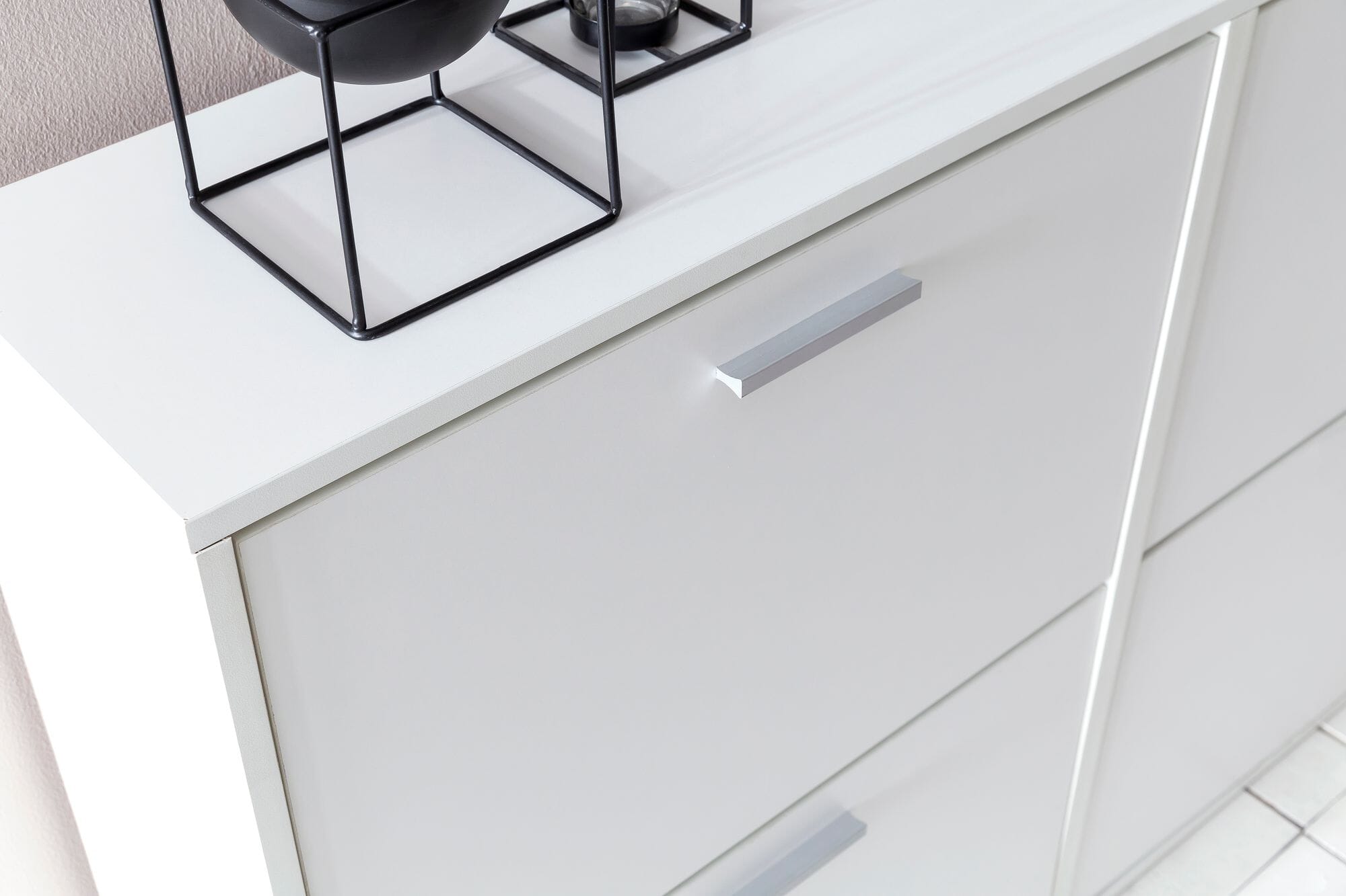 Dieser Schuhschrank bietet nicht nur eine große Ablagefläche für Deko und Schlüsselkorb, sondern auch vier Kippfächer mit insgesamt 8 Schuhablagen. In jedes Fach passen bis zu 3 Paar Schuhe, basierend auf Größe 39. Die zusätzliche Ablagefläche auf dem Schuhschrank bietet weiteren Stauraum.