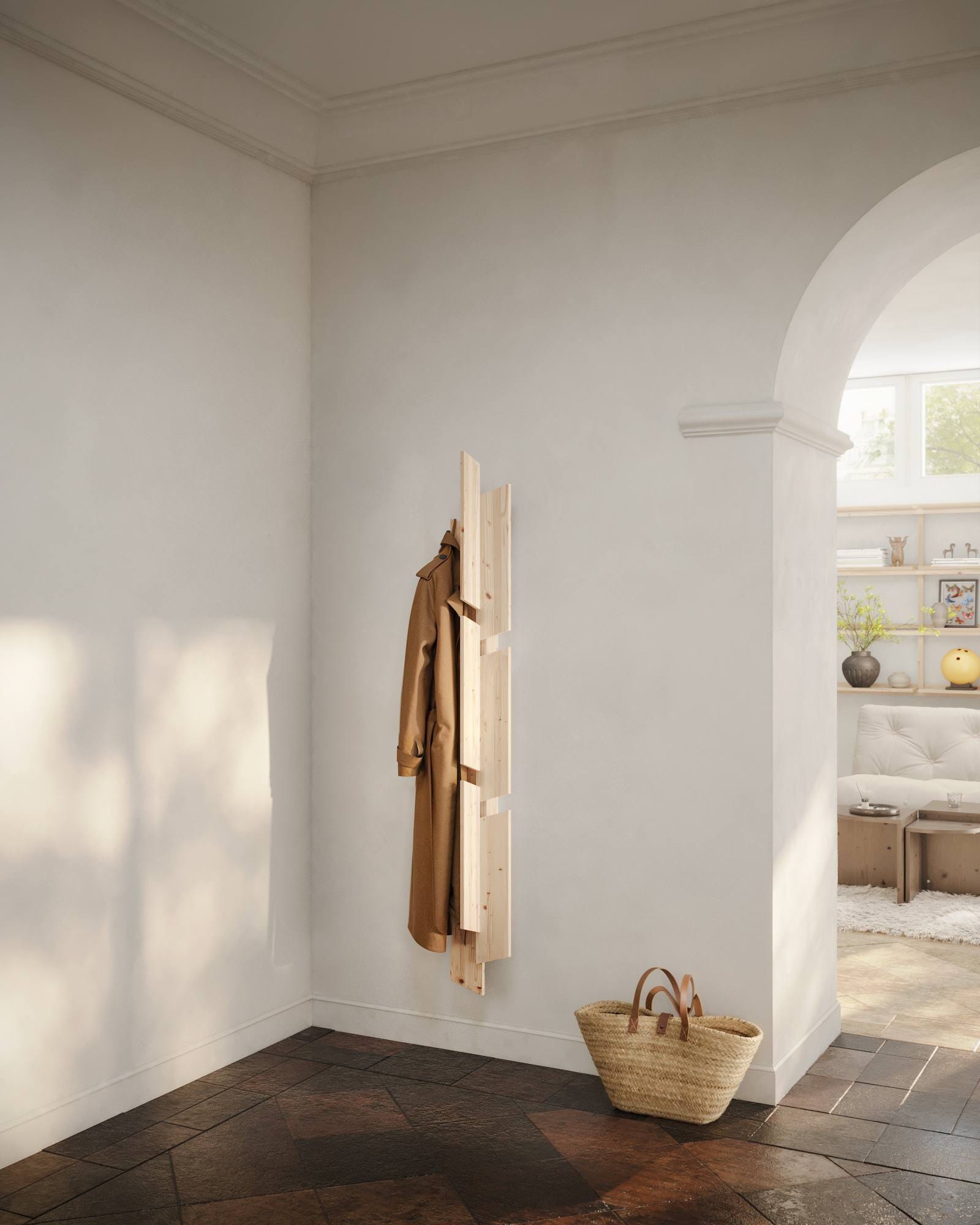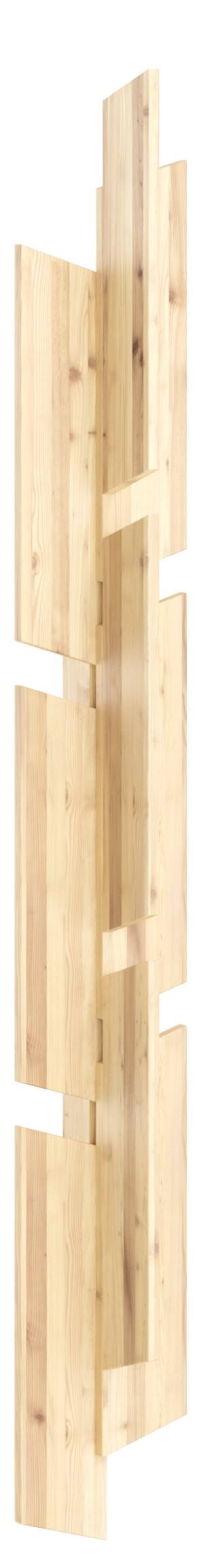 Die Wandgarderobe Keeper Coat Wall Rack wurde von Fabien Roy entworfen und verbindet eine organische Linie mit einer klaren Formensprache. Die aneinander und aufeinander montierten Bretter aus rohem unbehandeltem Kiefernholz machen ihn zu einem Möbelstück, das Eindruck macht – im Flur, im Schlafzimmer oder überall dort, wo du einen Blickfang mit Funktion und Charakter schaffen möchtest.