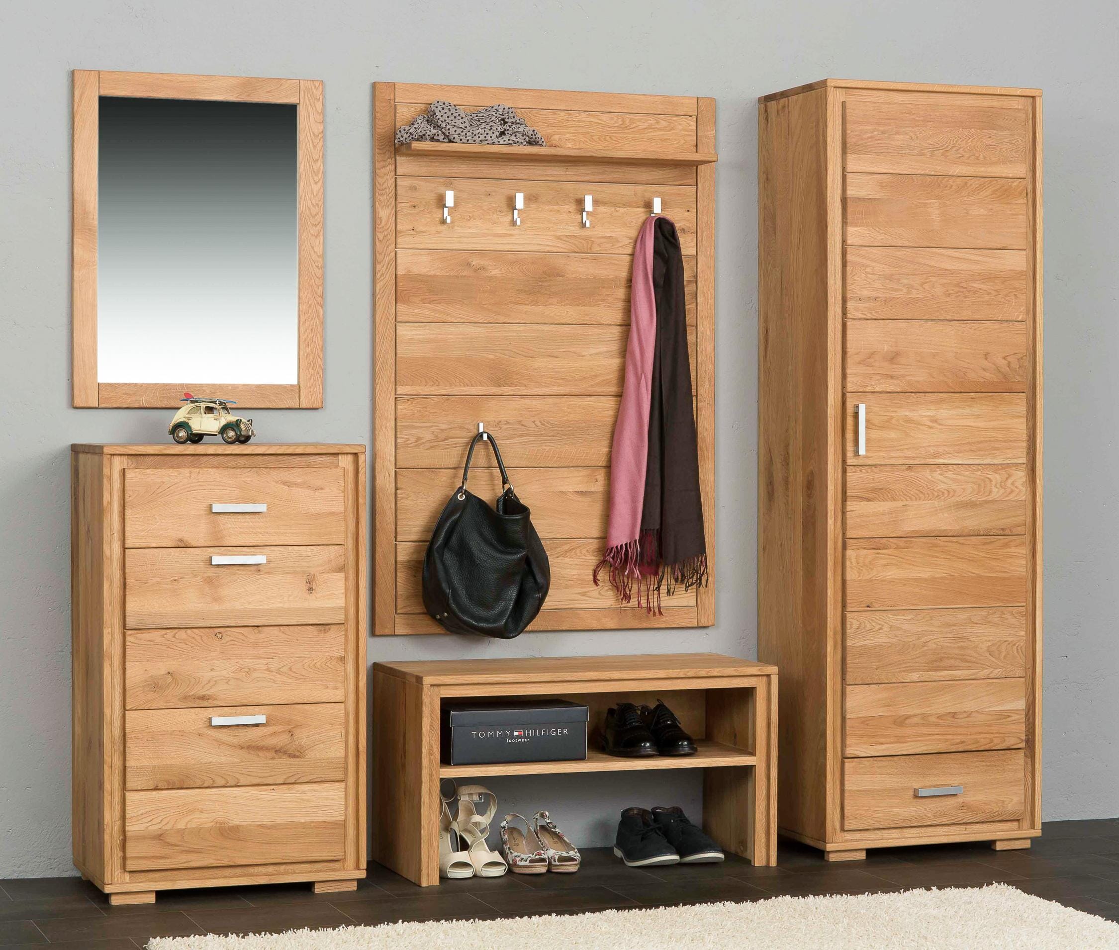 Die akzentvolle Optik der Holzoberflächen verleiht dem Wohnobjekt einen einmaligen Charakter. Die einzigartige Holzmaserung kommt durch die Behandlung mit Wachsen und Ölen noch besser zur Geltung. Das naturbelassene Material strahlt zudem Wärme und Gemütlichkeit aus. Dadurch entsteht eine einladende Stimmung in Ihrem Eingangsbereich. Die kompakte Aufmachung des Dielenschrankes Basel ermöglicht einen flexiblen Einsatz des Möbels sogar bei begrenztem Platzangebot. Dennoch bietet der praktische Schrank jede Menge Stauraum für Kleidung und Accessoires.