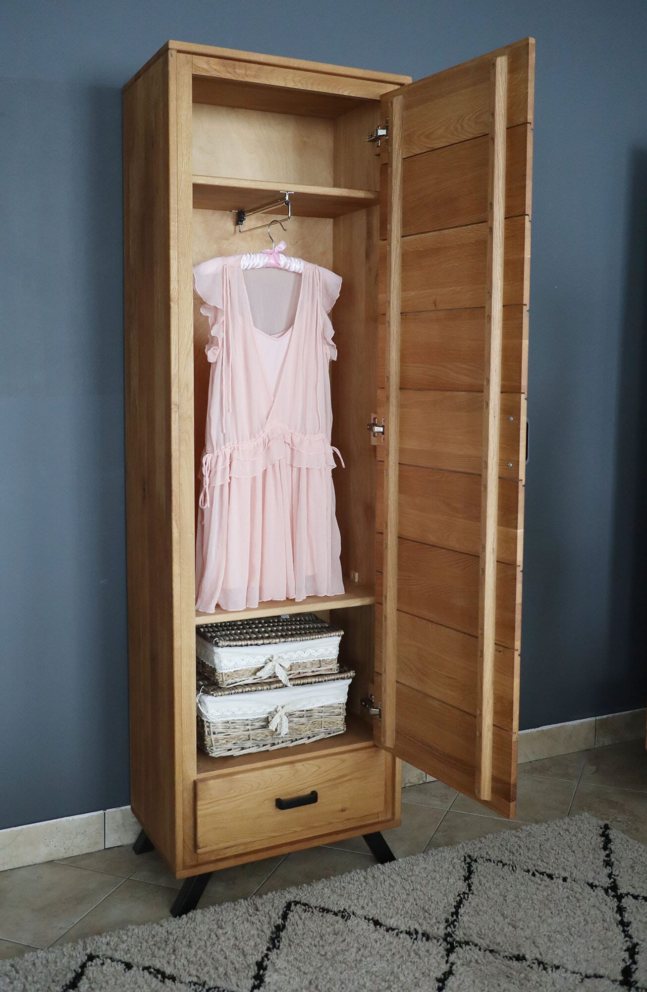 Dazu besteht das Wohnobjekt aus einem geräumigen Türfach und einer Schublade. Hinter der massiven Holztür sind drei verstellbare Fachböden und ein fester Boden mit Kleiderbügelauszug integriert. Für komfortable Handhabung verfügt die Tür über Softclose-Mechanismus. Stilvolle Metallgriffe komplettieren das tolle Schrankdesign.
