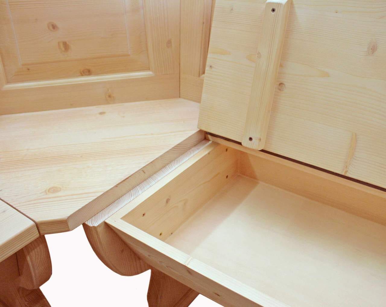 Die Eckbank Bozen ist aus massiver Fichte gefertigt. Unter der Sitzfläche der Eckbank findet man ausreichend Platz für Tischdecken oder Sets. Der Stauraum der Truhenbank ist etwa 12 cm tief.