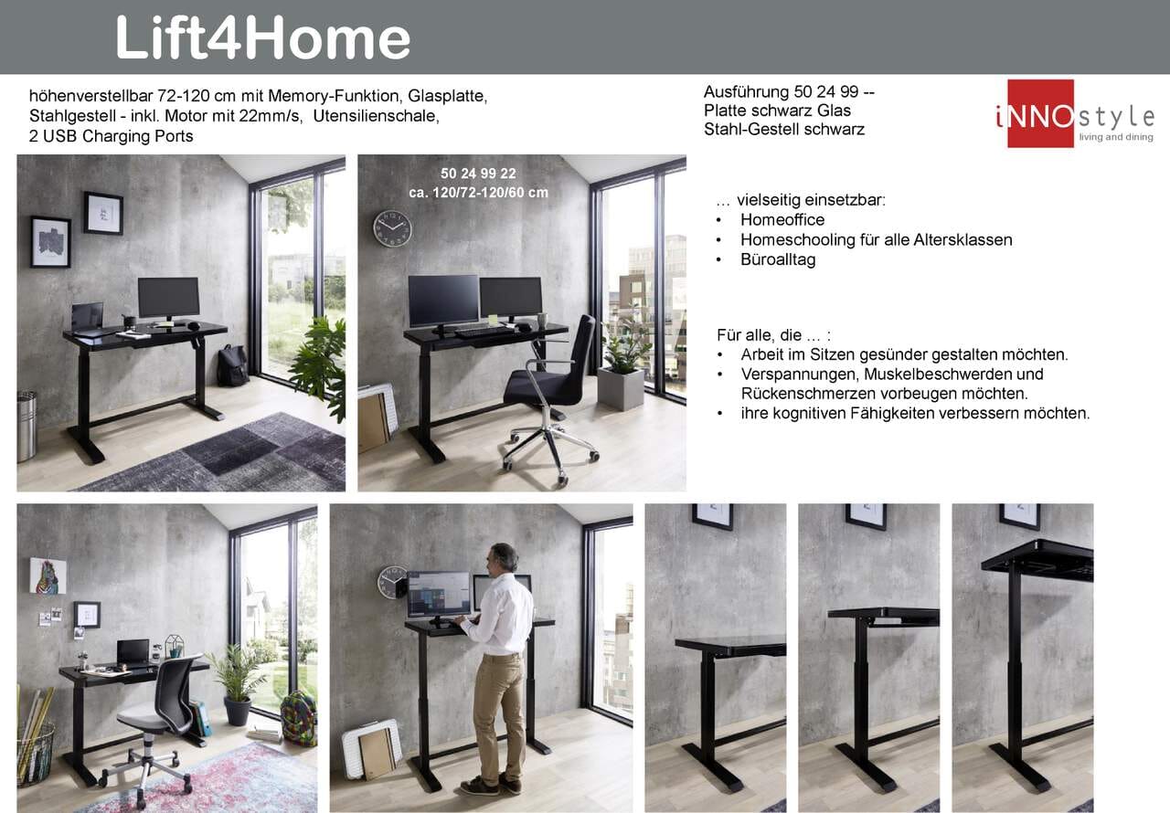 Höhenverstellbarer Schreibtisch elektrisch LIFT4HOME in schwarz mit USB