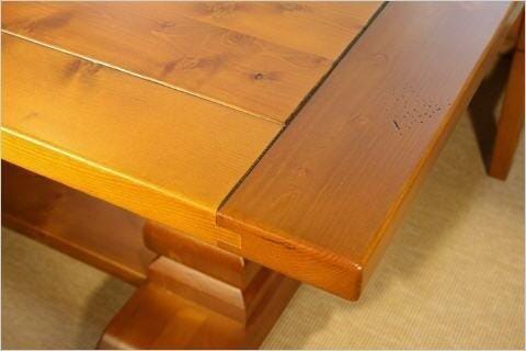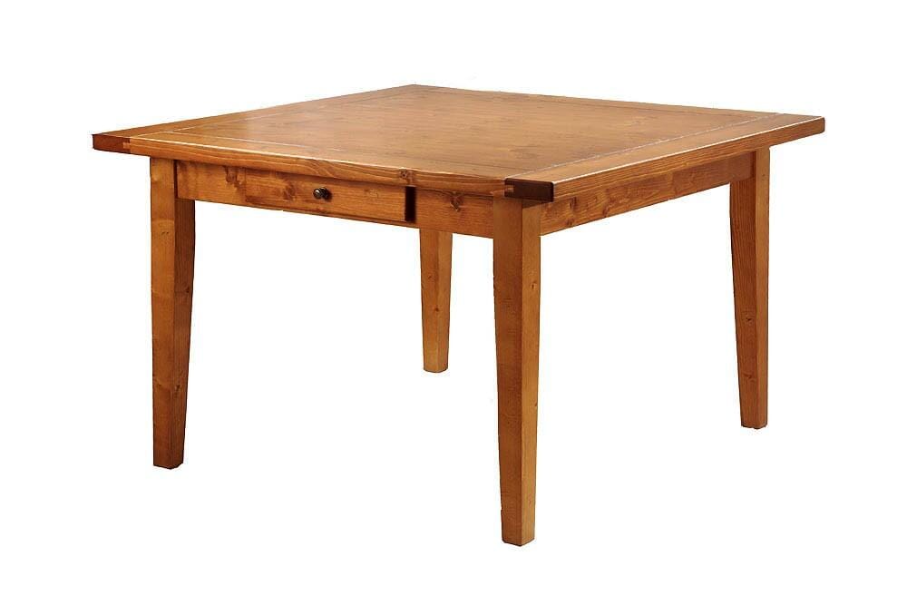 Der Esstisch Cadore ist aus massiver Fichte gefertigt. Es stehen 4 verschiedene Größen zur Wahl. Der Esstisch hat eine etwa 4 cm dicke Tischplatte in Rahmenbauweise und eine Schublade mit Knopf aus patiniertem Messing.