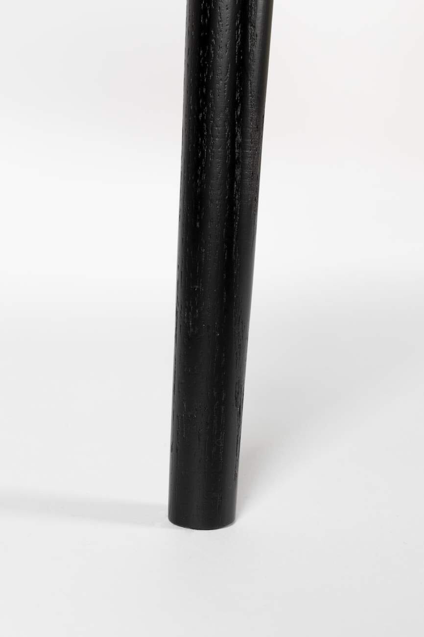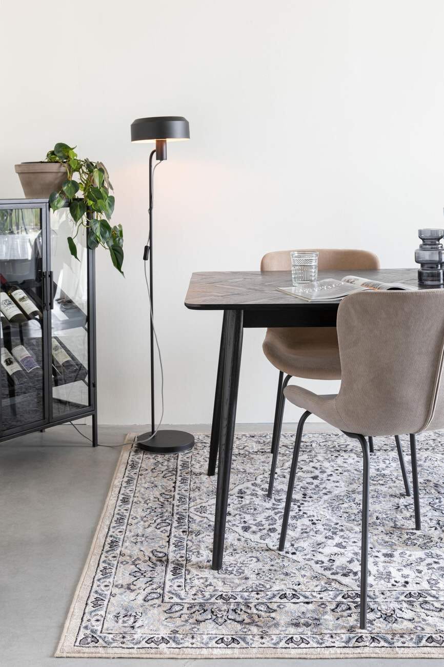 Die Tischplatte des Esstischs Fabio besteht aus einer MDF-Platte und ist aufwendig im Fischgrätmuster furniert. Das stabile Untergestell ist aus Massivholz gefertigt und schwarz lackiert.