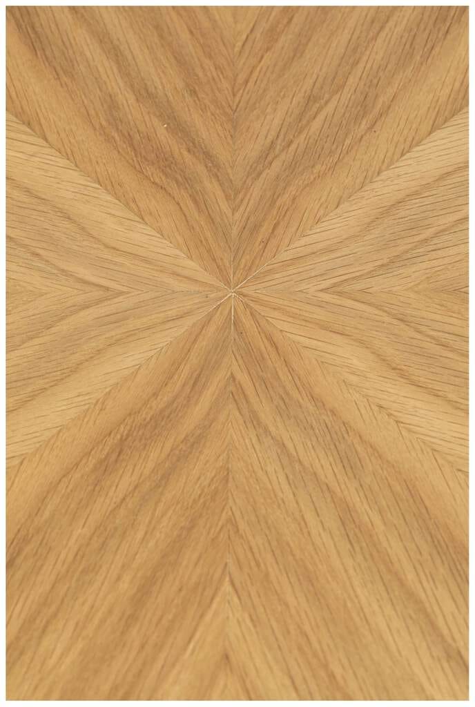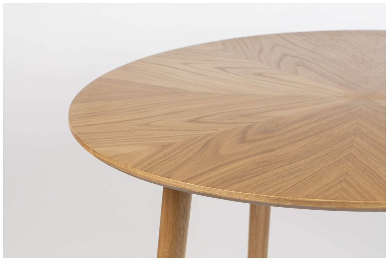 Die runde Tischplatte des Esstischs Fabio besteht aus einer MDF-Platte und ist aufwendig furniert. Das stabile Untergestell ist aus Massivholz gefertigt und im Farbton Natur lackiert.