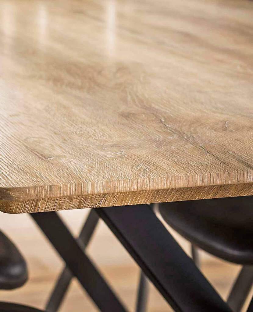 MDF stand hier zur Verfügung, es wurde mit einer Beschichtung in Eiche verschönert. Das wirkt nett und ist zugleich auch sehr pflegeleicht. Die Beine bestehen aus Stahl und setzen durch ihre kühne Konstruktion ebenfalls einen raffinierten Akzent.
