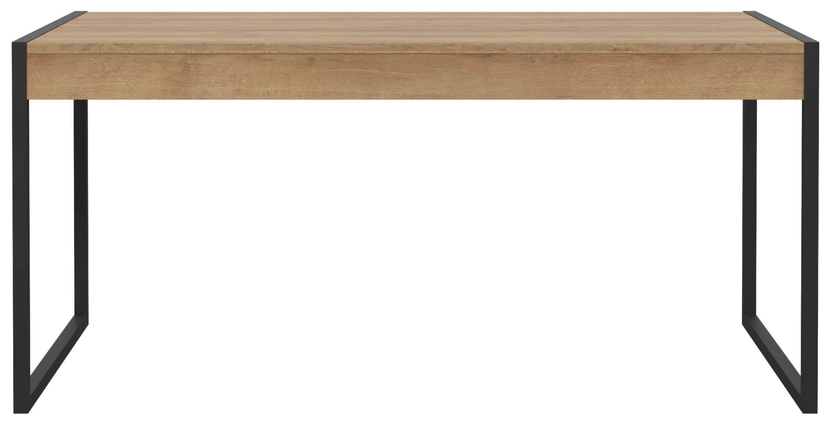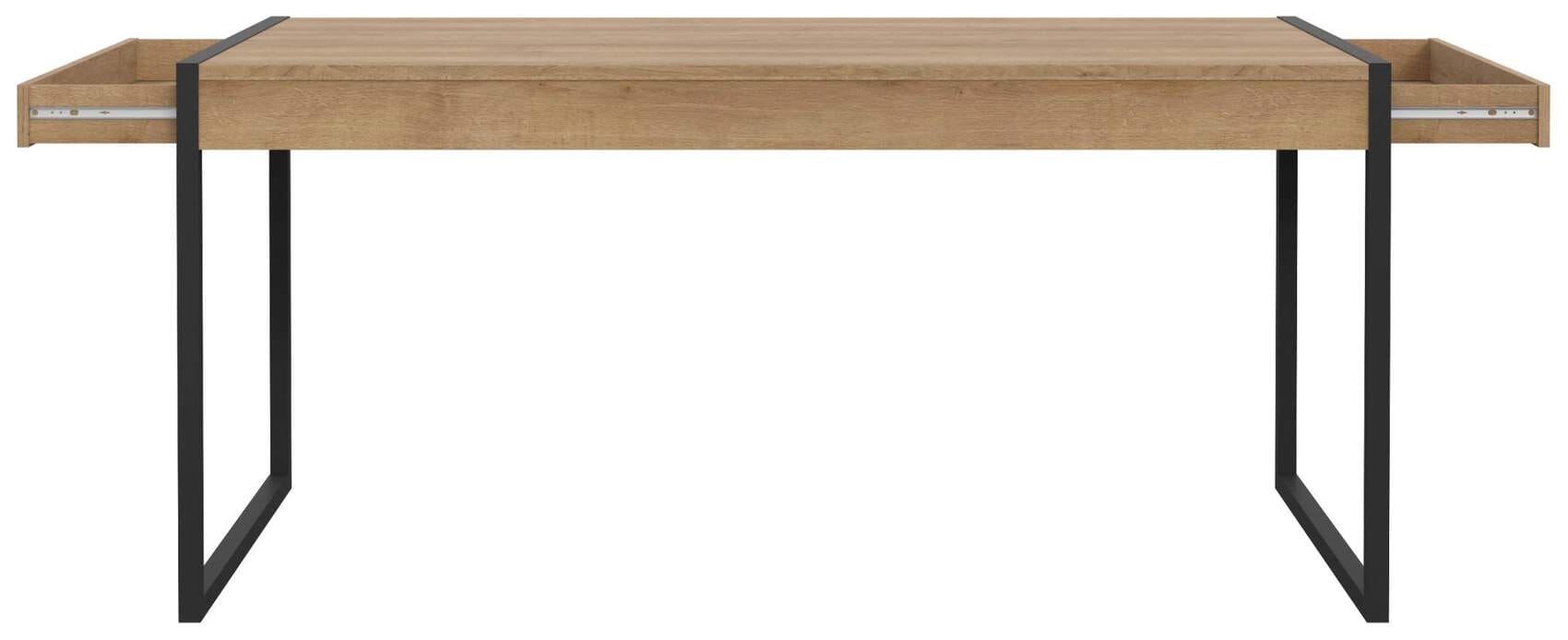 Vor allem der Kontrast aus naturnaher Tischplatte und kühlem Metallgestell aus schwarzem Eisen sorgt ganz bestimmt für Hingucker. Die Platte des Tisches ist aus beschichteter Spanplatte hergestellt und in der Riviera Eiche Nachbildung gehalten.