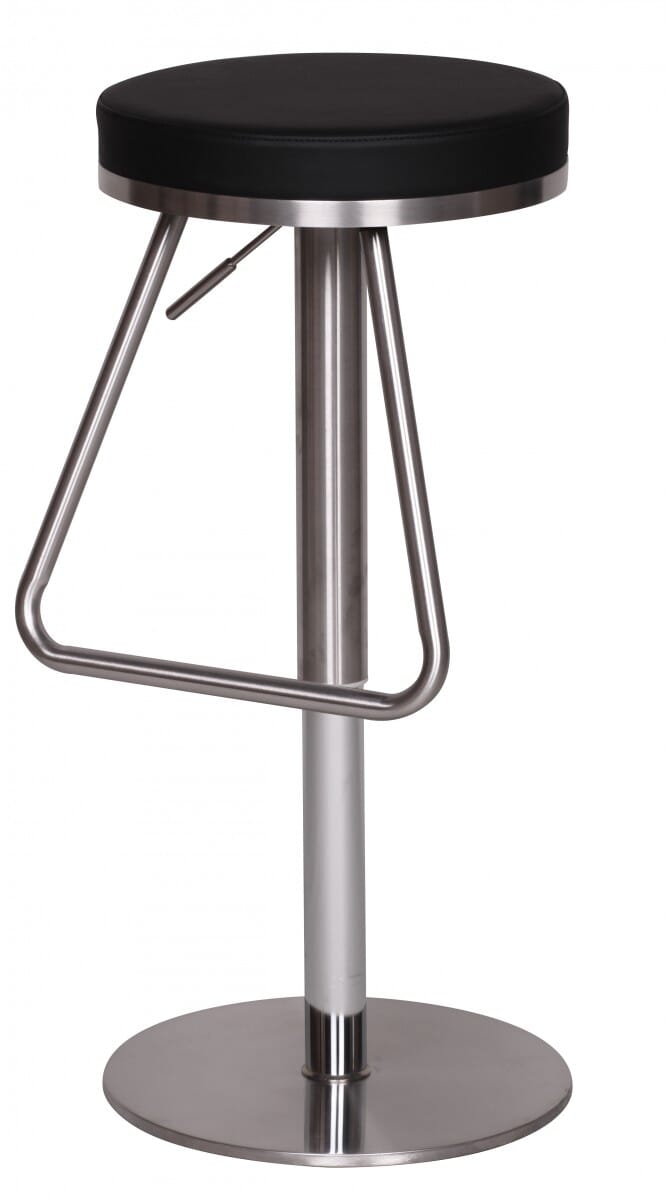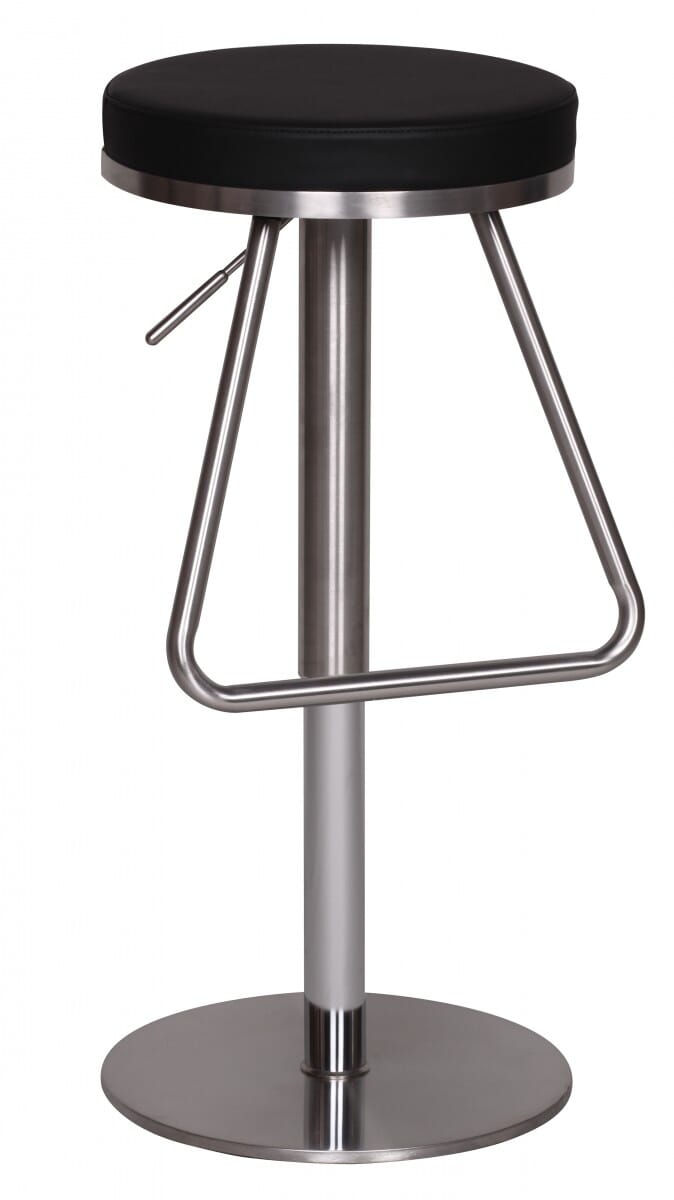 Das moderne Design mit der runden, gepolsterten Sitzfläche, die in einem Edelstahlring eingelassen ist, und die formschöne Triangel Fußablage machen diesen Hocker zu einem echten Hingucker.