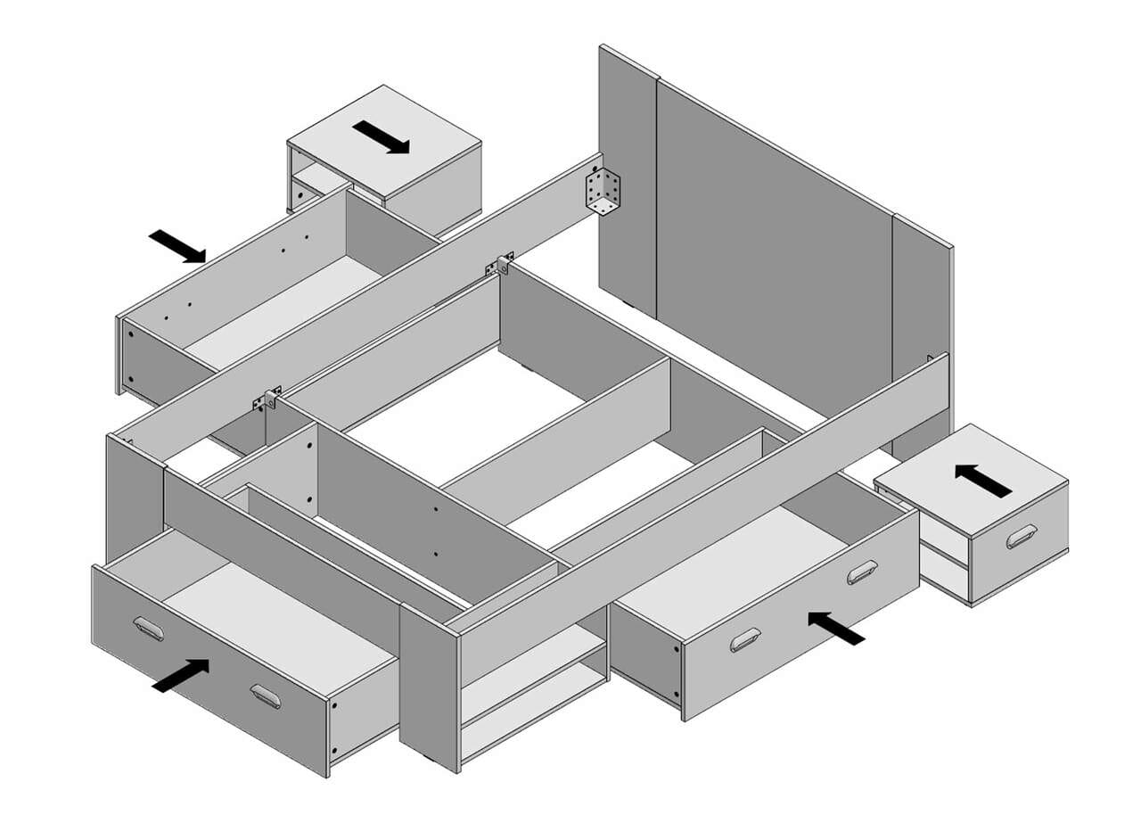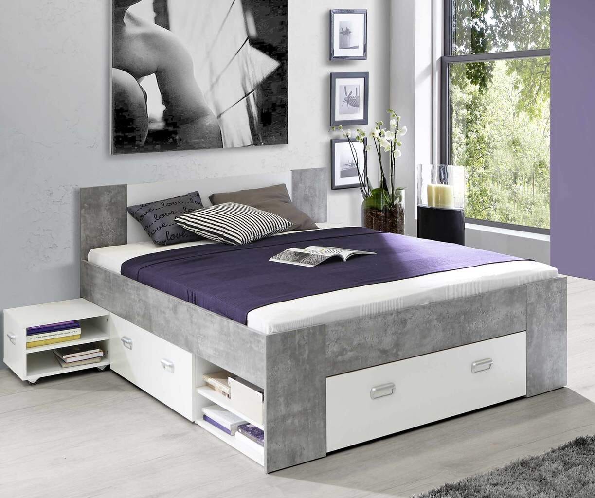 Am Fußende und an den Seiten befinden sich große Schubkästen, die mit leicht laufenden Rollen ausgestattet sind. Die Kästen werden seitlich geführt und lassen sich dadurch einfach öffnen und schließen. Die weiß beschichtetet Fronten der Schubkästen bilden einen schönen Kontrast zum modernen Grauton der Betonoptik und sind mit zwei silbernen Kunststoffgriffen versehen. Links und rechts am Fußende befinden sich zwei Fächer mit fest eingelegten Fachböden. Zwei Nachtkonsolen, die ebenfalls im Lieferumfang enthalten sind, können am höher gestalteten Kopfteil platziert werden.
