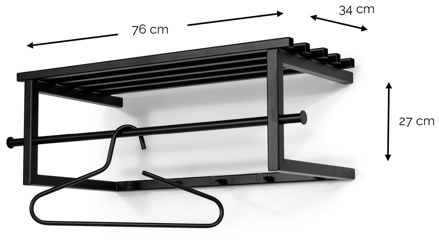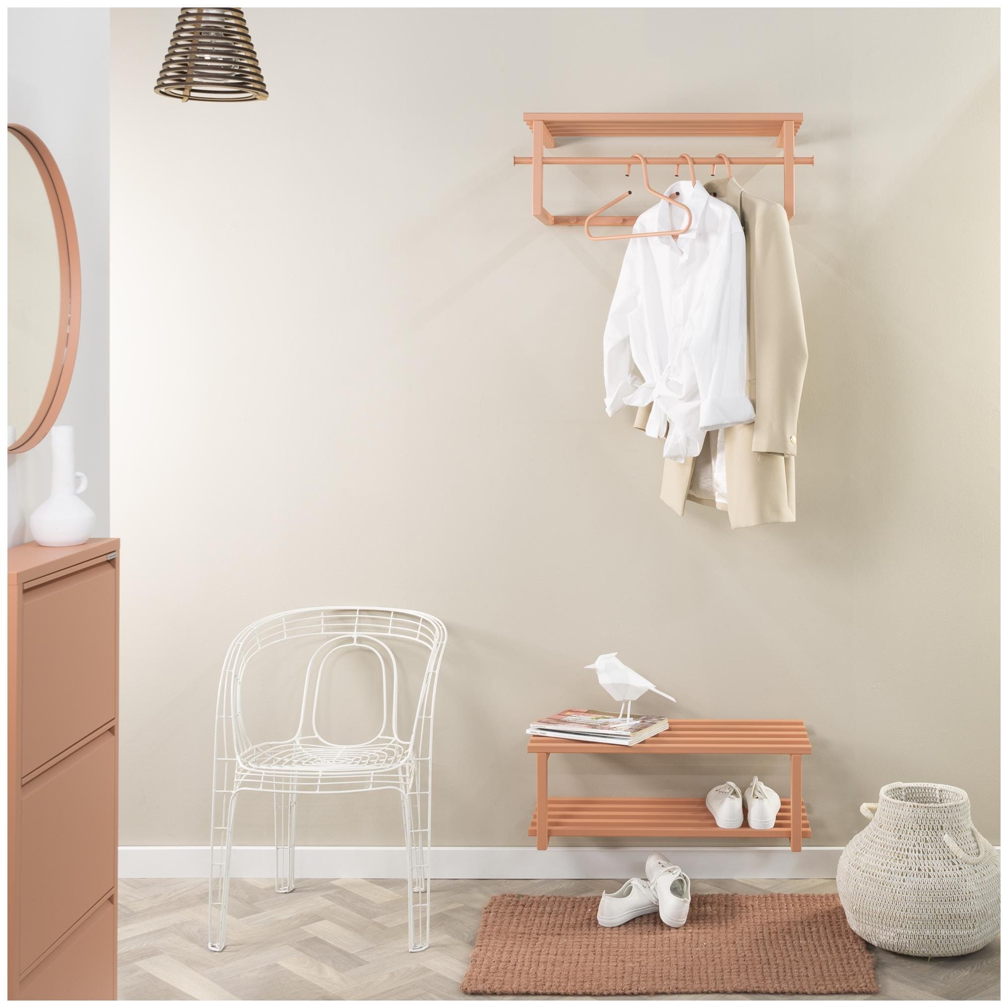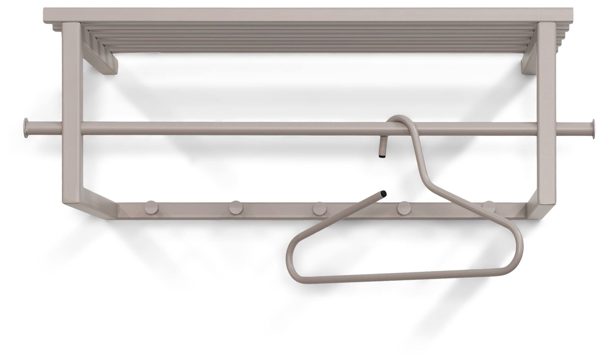 Die fünf Kleiderhaken an der Rückwand der praktischen Garderobe eignen sich für leichte Strickjacken oder schmale Handtaschen. An der mittig angebrachten Kleiderstange lassen sich Mäntel oder Winterjacken auf Bügeln unterbringen.