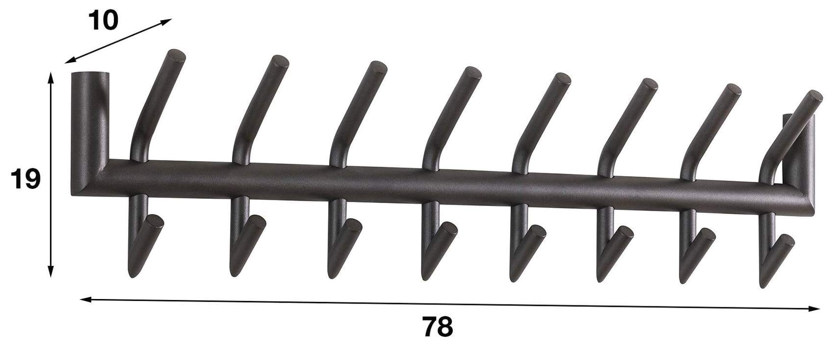 Die Garderobenleiste wird aus matt pulverbeschichtetem Stahl hergestellt und besitzt insgesamt 18 stabile Haken zum Aufhängen von Jacken und Mäntel.