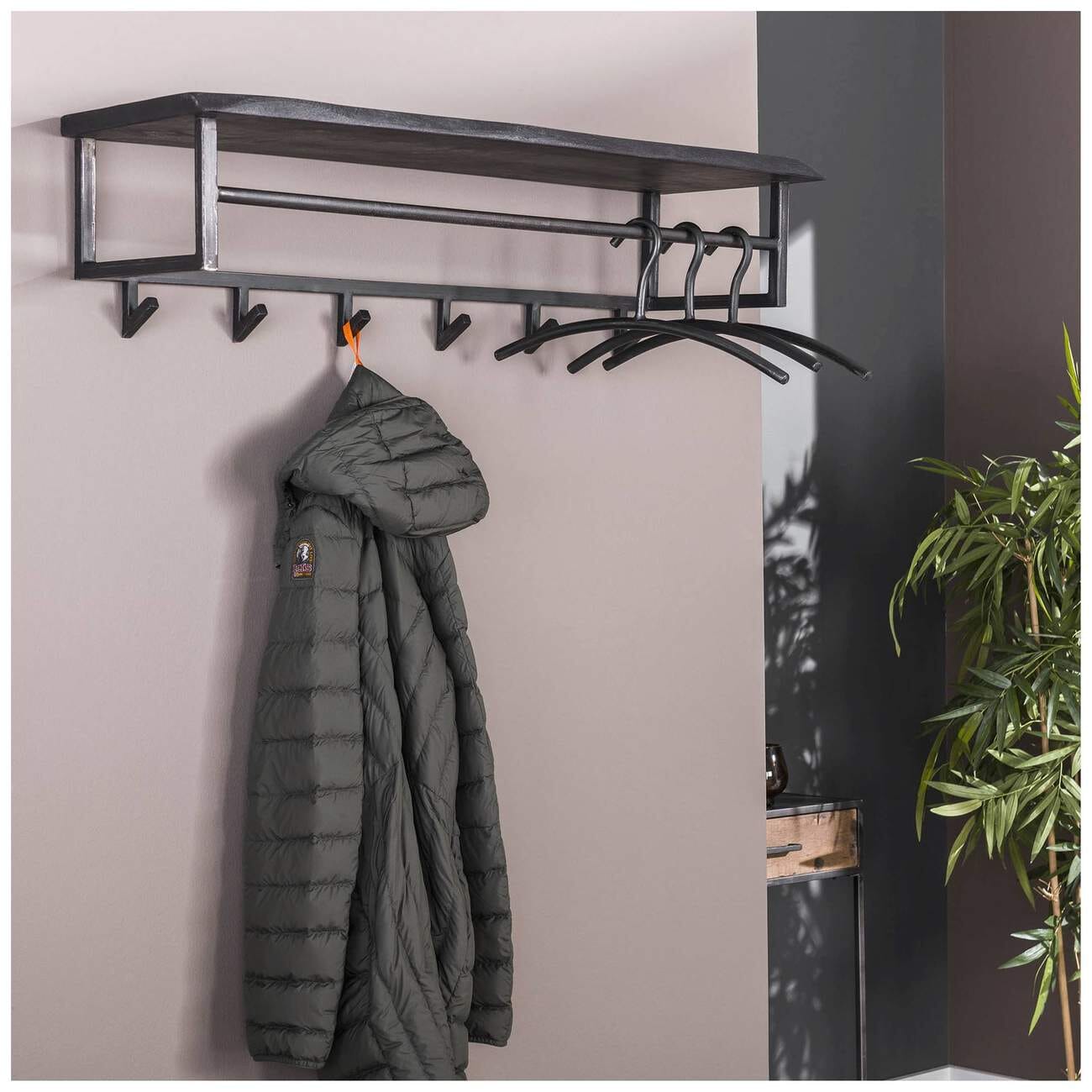 Nicht nur Metall spielt bei dieser Garderobe eine tragende Rolle. Auch ein uriges Stück Holz mit Baumkante ist mit daran beteiligt, dass Sie sich freuen, wenn Sie den Flur betreten und Ihnen ein dienstbarer Geist gleich alles abnimmt, was Sie gerne los werden möchten.