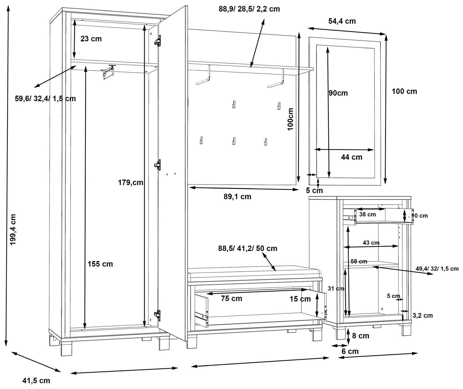 Je nach zur Verfügung stehendem Platz können Sie die Garderobenset individuell aufstellen. Die verschiedenen Elemente sind links oder rechts vom Schrank anzuordnen. Dank der kleinen Füße aus Metall lässt sich der Boden unter den Schrankelementen bei Bedarf gut reinigen.
