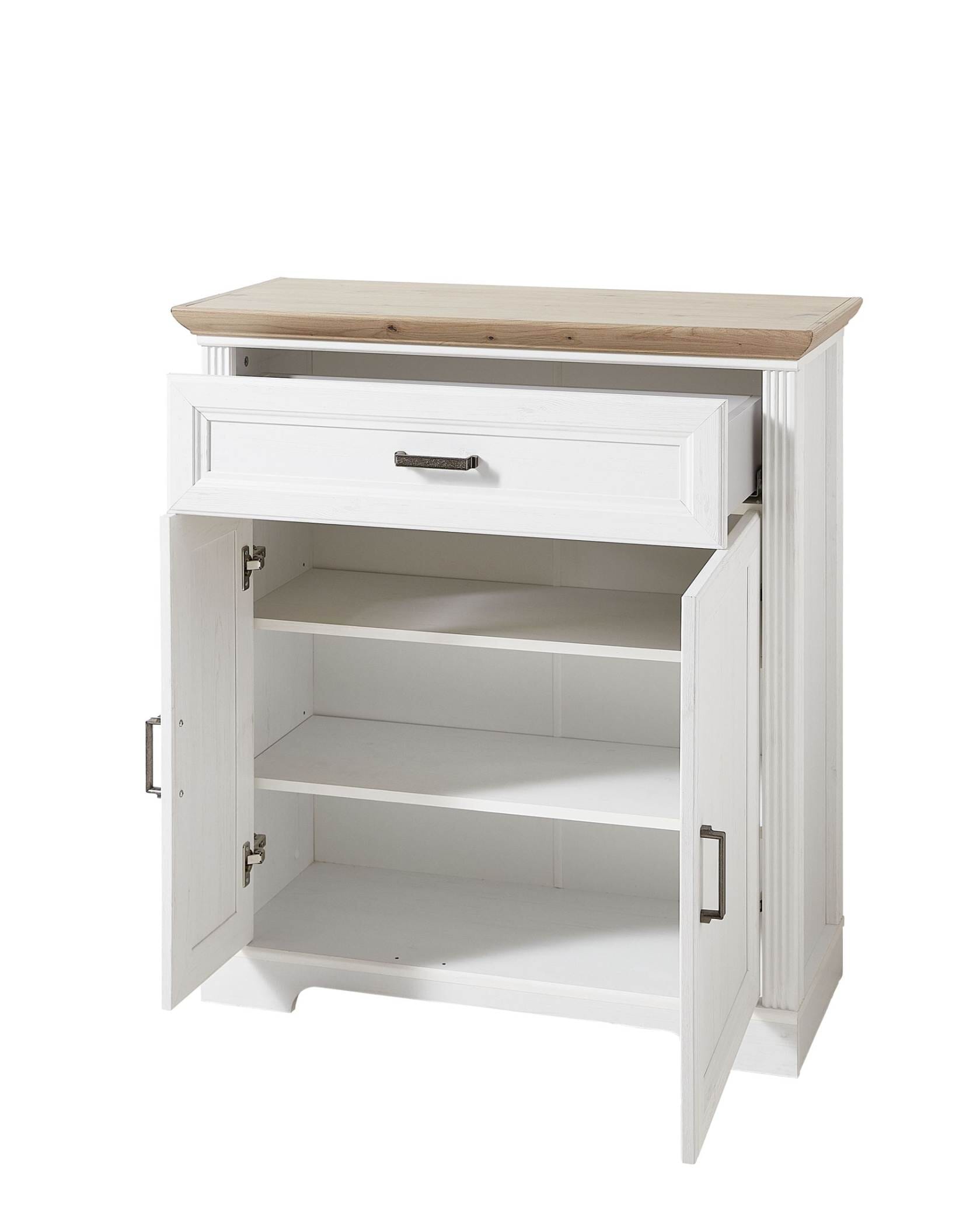 Das edle Holzdekor der Pinie ist perfekt verarbeitet und von zeitlos natürlicher Ausstrahlung. Optisch ebenfalls gelungen sind die zweifarbige Gestaltung der Möbel in Weiß und Naturbraun sowie die kontrastfarbenen Griffe und Haken aus edlem Metall. Der Unterschrank weist einen massiven Holzboden auf und teilt die Aufbewahrung in zwei Bereiche.