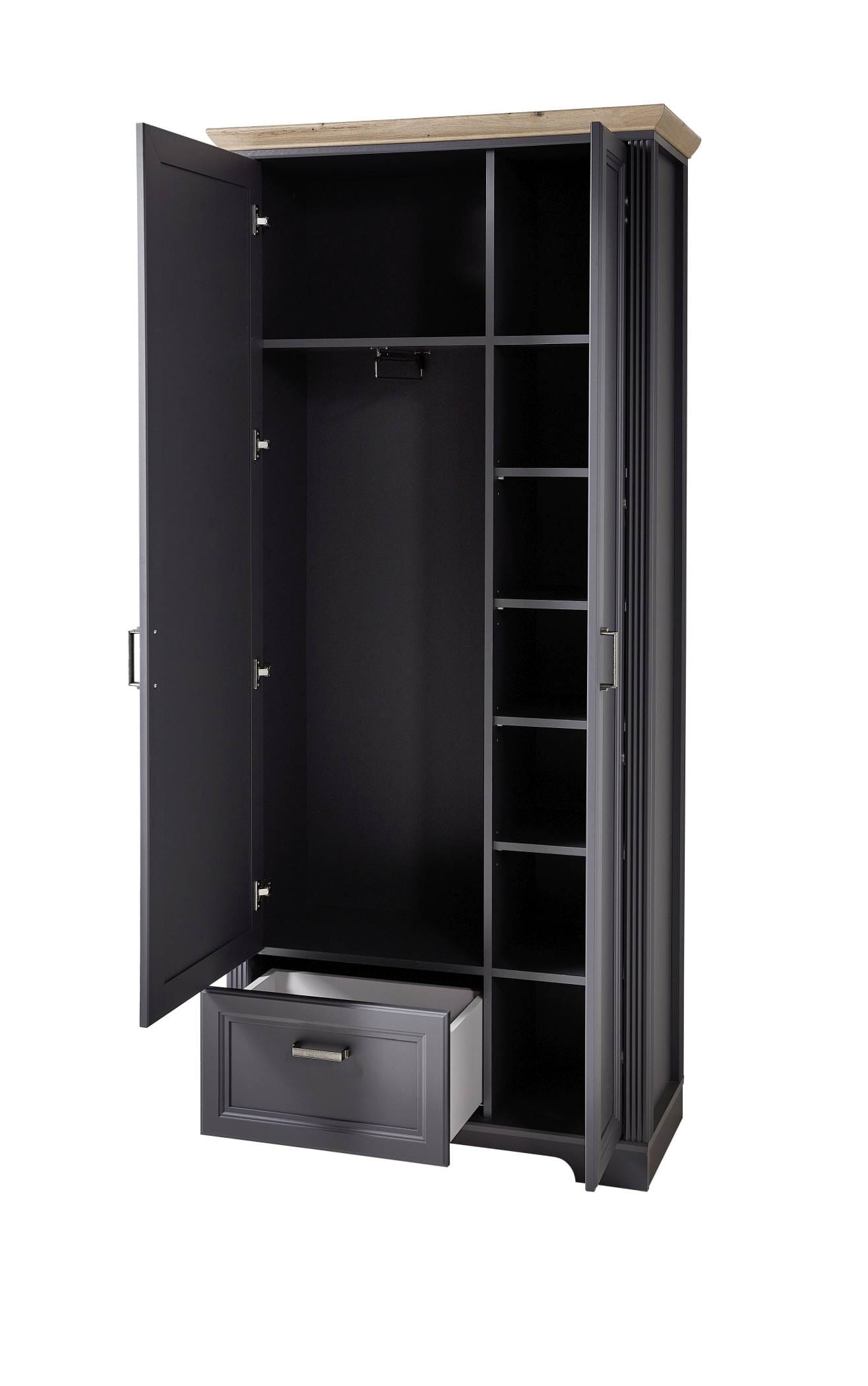 Die Garderobenelemente bieten innen mehrere Ablagen sowie eine Kleiderstange zum Aufhängen Ihrer feinen Mäntel. Zum Öffnen und Schließen der Türen und Schübe dienen kleine Griffe aus wertigem Metall. Dank Soft-Close-Automatik lassen sich Schübe und Türen angenehm leise bedienen.