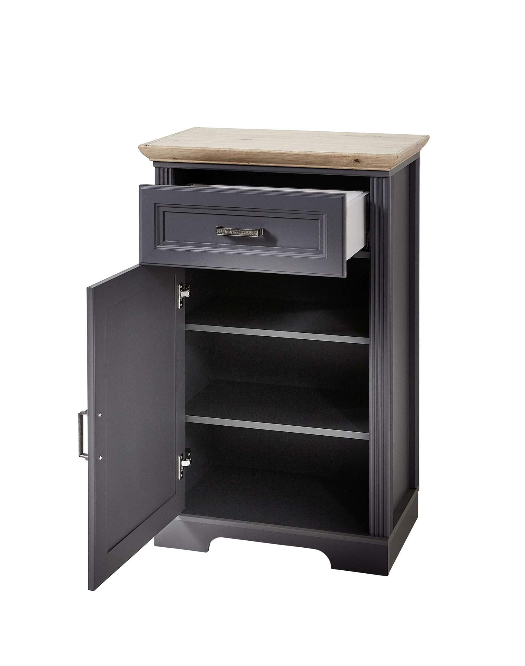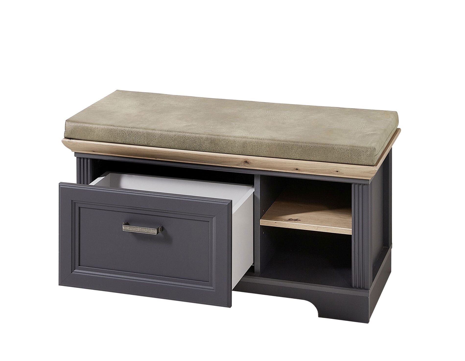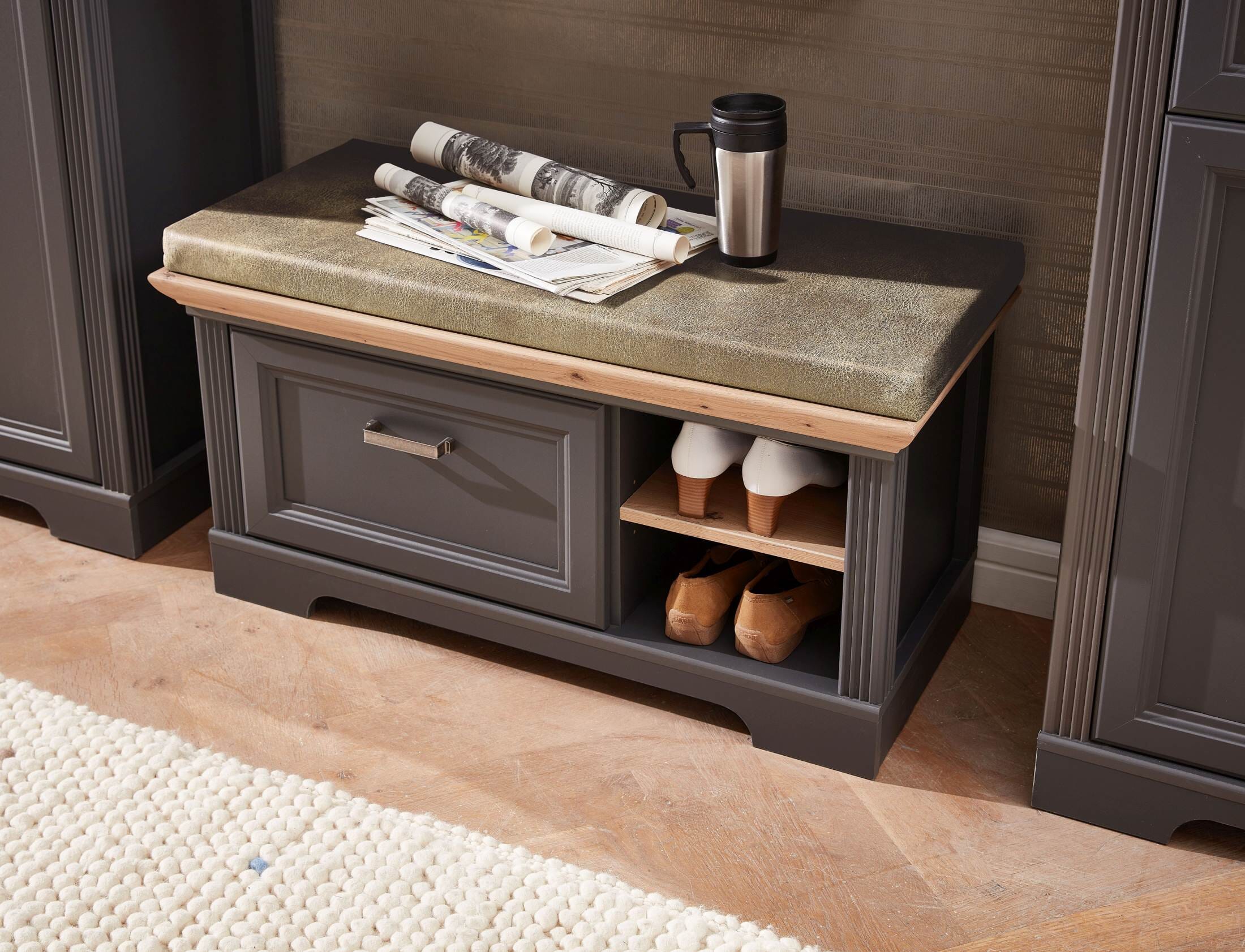 Ein formvollendetes Möbelprogramm für den gehobenen Anspruch stellt das Garderobenset JASMIN GH82 Farbton Graphit 5-teilig dar. Die Kombination für die Diele besteht aus den Komponenten Garderobenschrank und -paneel, Sitzbank mit Kissen, Schuhschrank sowie Spiegel mit Ablage. Damit stehen Ihnen für die Aufbewahrung Ihrer Jacken und Mäntel, Schuhe und Schirme, Taschen und Accessoires die verschiedensten Stauelemente zur Verfügung.