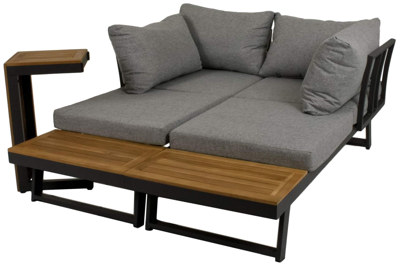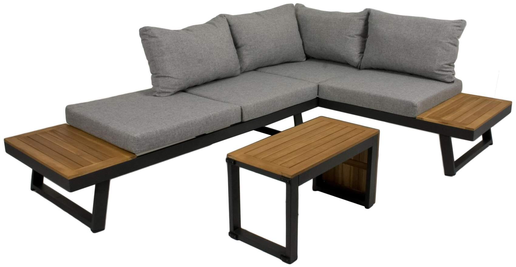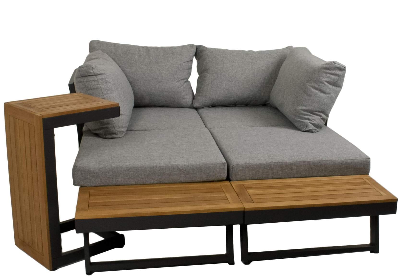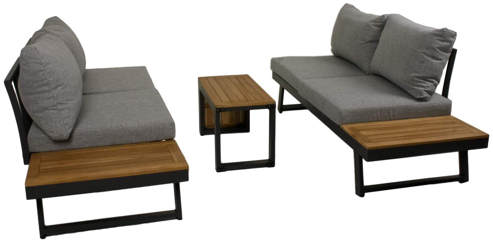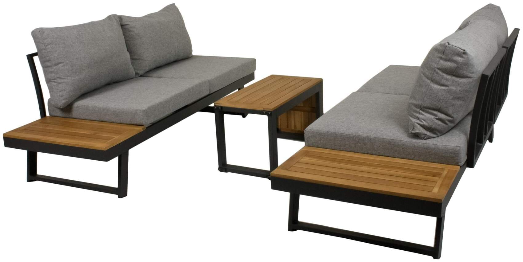 Die 3-teilige Lounge-Gruppe Felice besteht aus 2 Sofas und einem Tisch inklusive Auflagen und Kissen. Das Gestell besteht aus Aluminium, die Polster aus Polyester und die Ablageflächen sowie der Tisch sind in Akazie FSC gehalten.