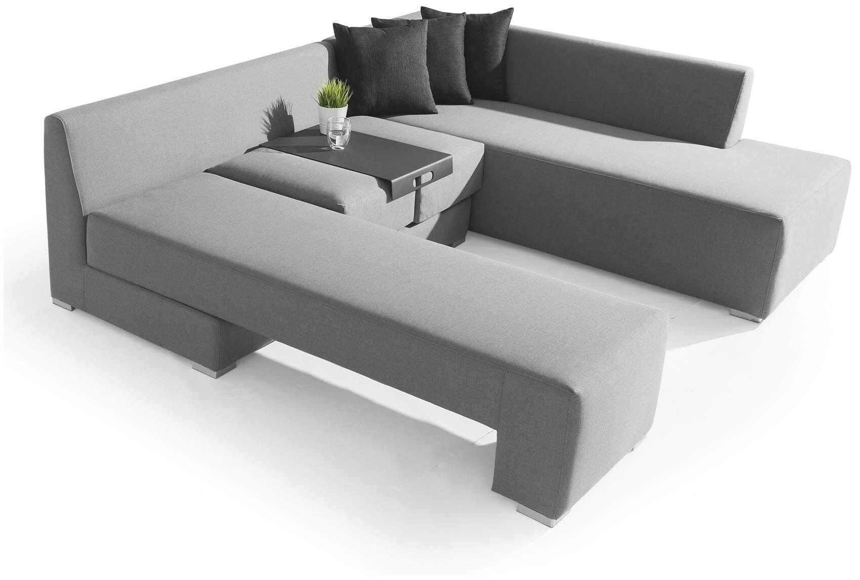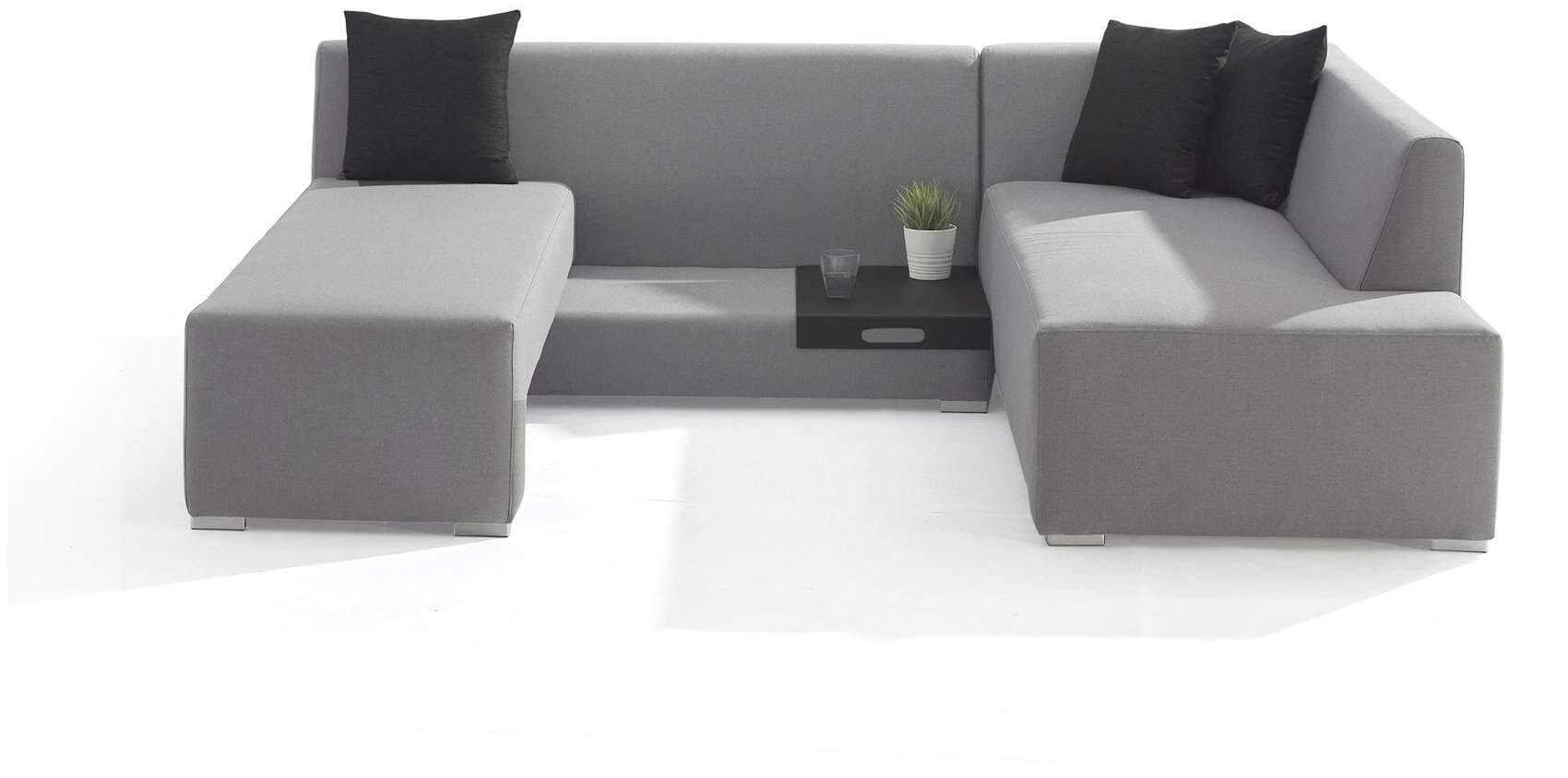 Das graue Lounge-Set Wellington besteht aus einem 2er Sofa, einem Langhocker und einem Langhocker mit Armlehne mit wasserfestem Bezug.
