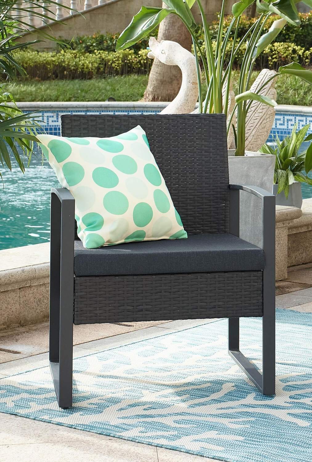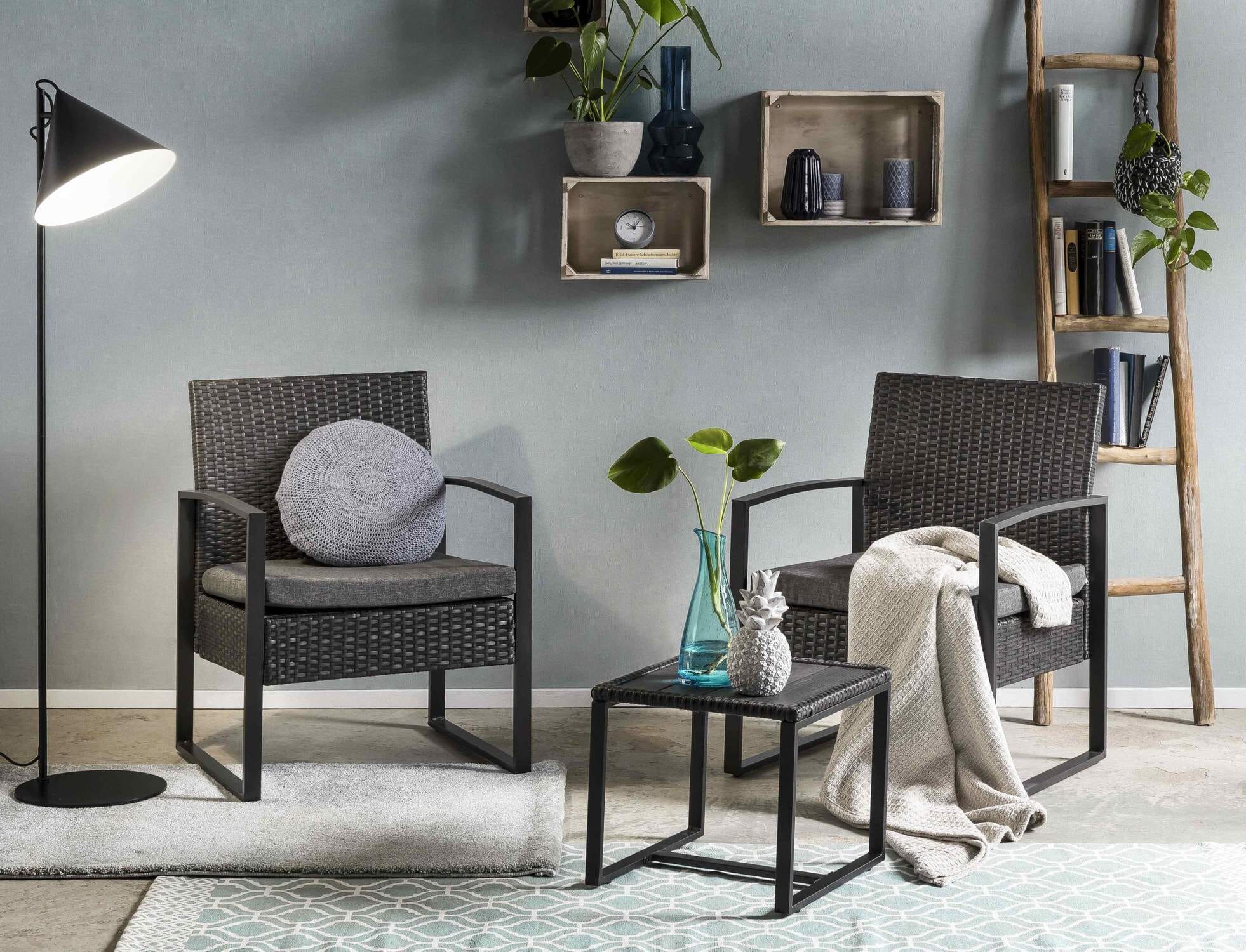 Zudem sorgen die besonders dicken Sitzkissen, die Armlehnen, sowie die leicht erhöhte Rückenlehne für einen sehr angenehmen Sitzkomfort. Das Set ist wetterfest und somit bestens für den Outdoor Bereich geeignet.