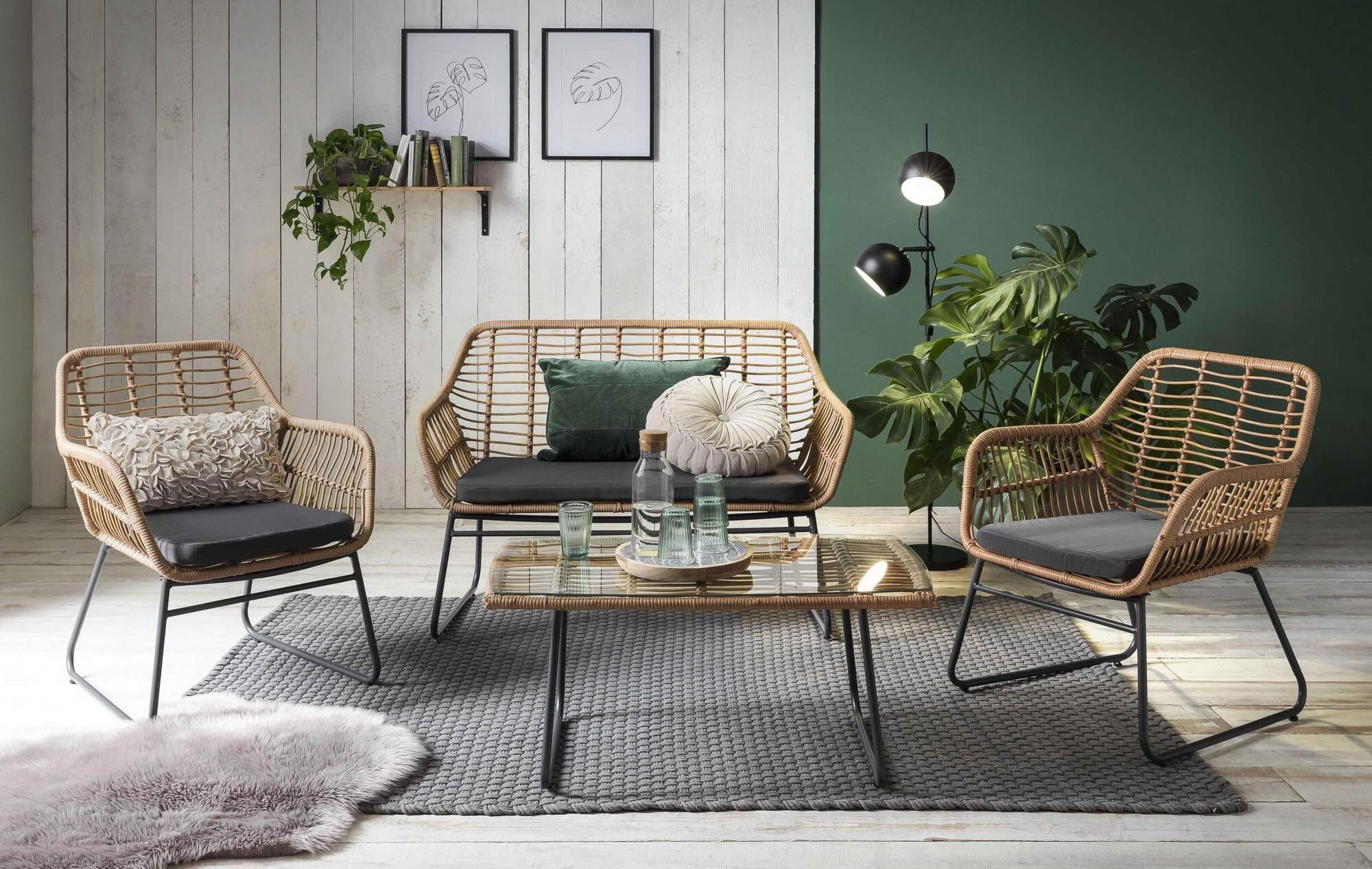 - Geflecht natur, Beine schwarz, Kissen grau
