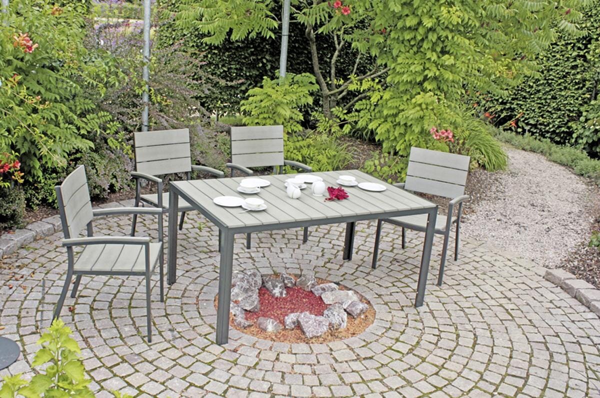 Die Gartentischgruppe OLIVIA zeichnet sich durch das Aluminiumgestell (anthrazit) und die hellgraue Nonwoodlattung aus. Dieser Materialmix sorgt für die gute Beständigkeit und pflegeleichten Eigenschaften des Set.