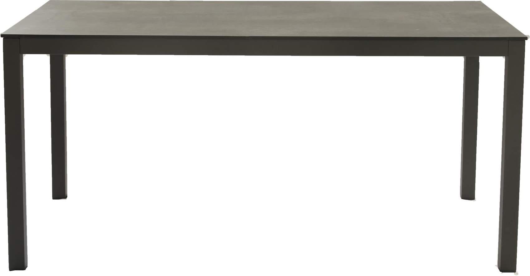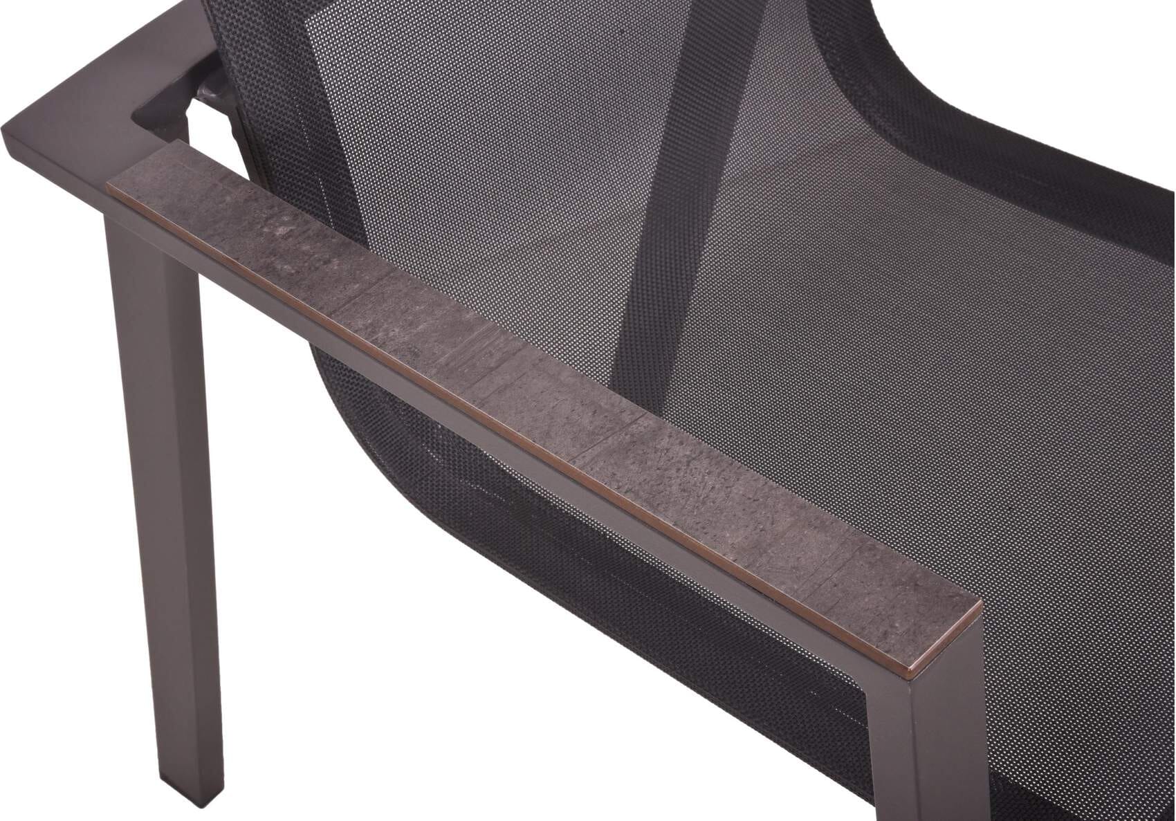 Der geradlinig gestaltete Stapelstuhl mit wetterfestem Aluminiumgestell in anthraziter Pulverbeschichtung bietet hohen Sitzkomfort auf dem ebenso dunklen Kunststoffgewebe der Sitz- und Rückenfläche.
