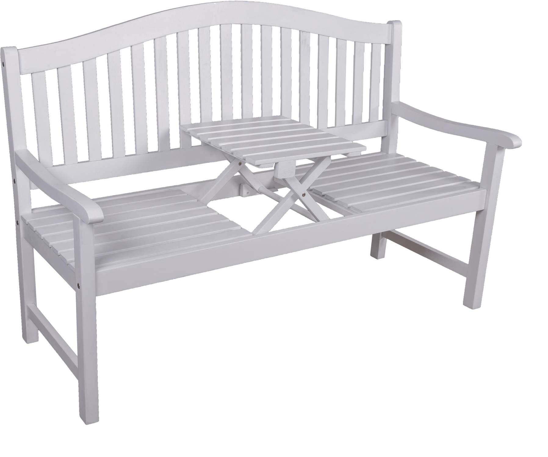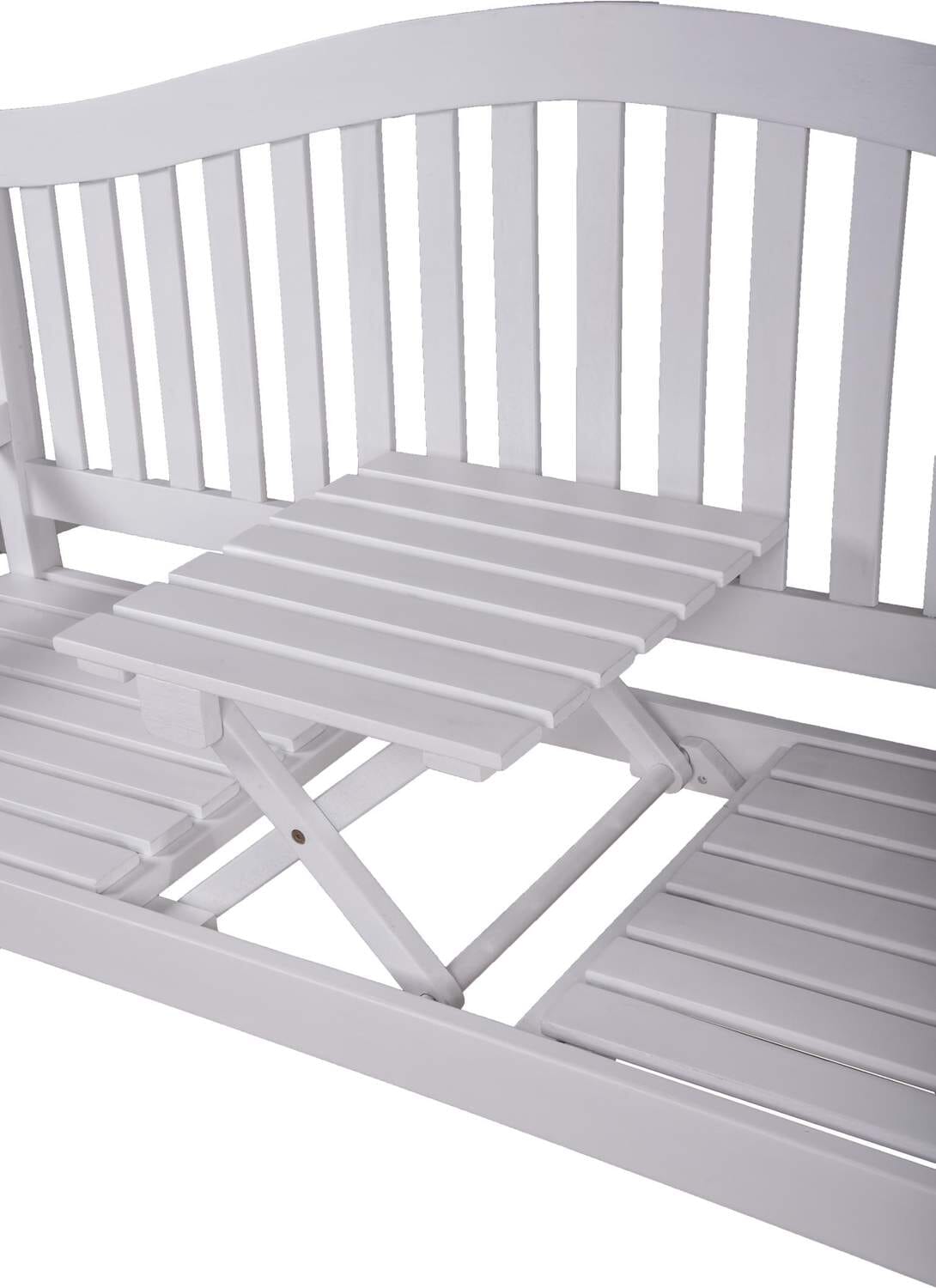 Schöner könnten die gemeinsamen Stunden zu zweit nicht sein. Dank dieser Gartenbank mit hochklappbarem Tisch aus 100% Eukalyptus Weiß ist die kleine Auszeit schnell bereitet. In der Mitte der Sitzfläche ist ein hochklappbarer Tisch integriert. So findet das Geschirr für den kleinen Snack schnell einen Platz. Mit einem Handgriff wird der kleine Tisch auf- oder wieder zusammengeklappt. Praktische Gartenbänke dieser Art erleichtern den Alltag.