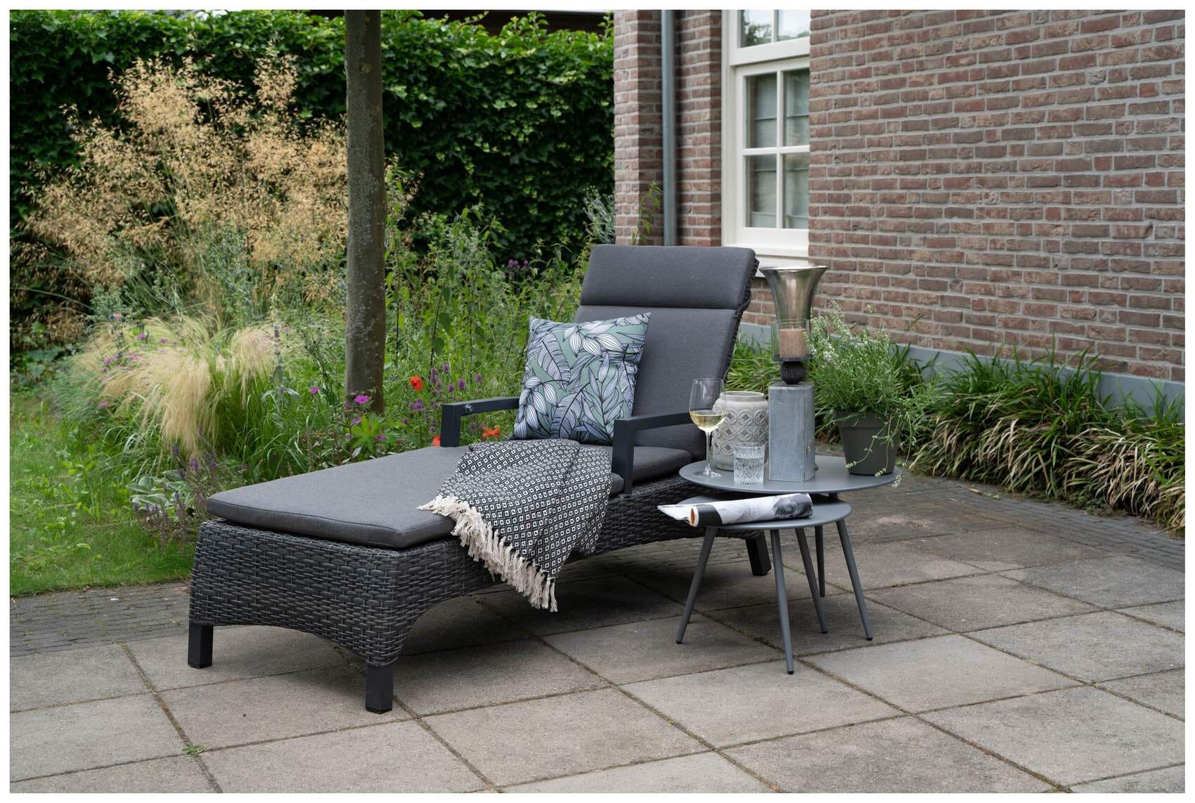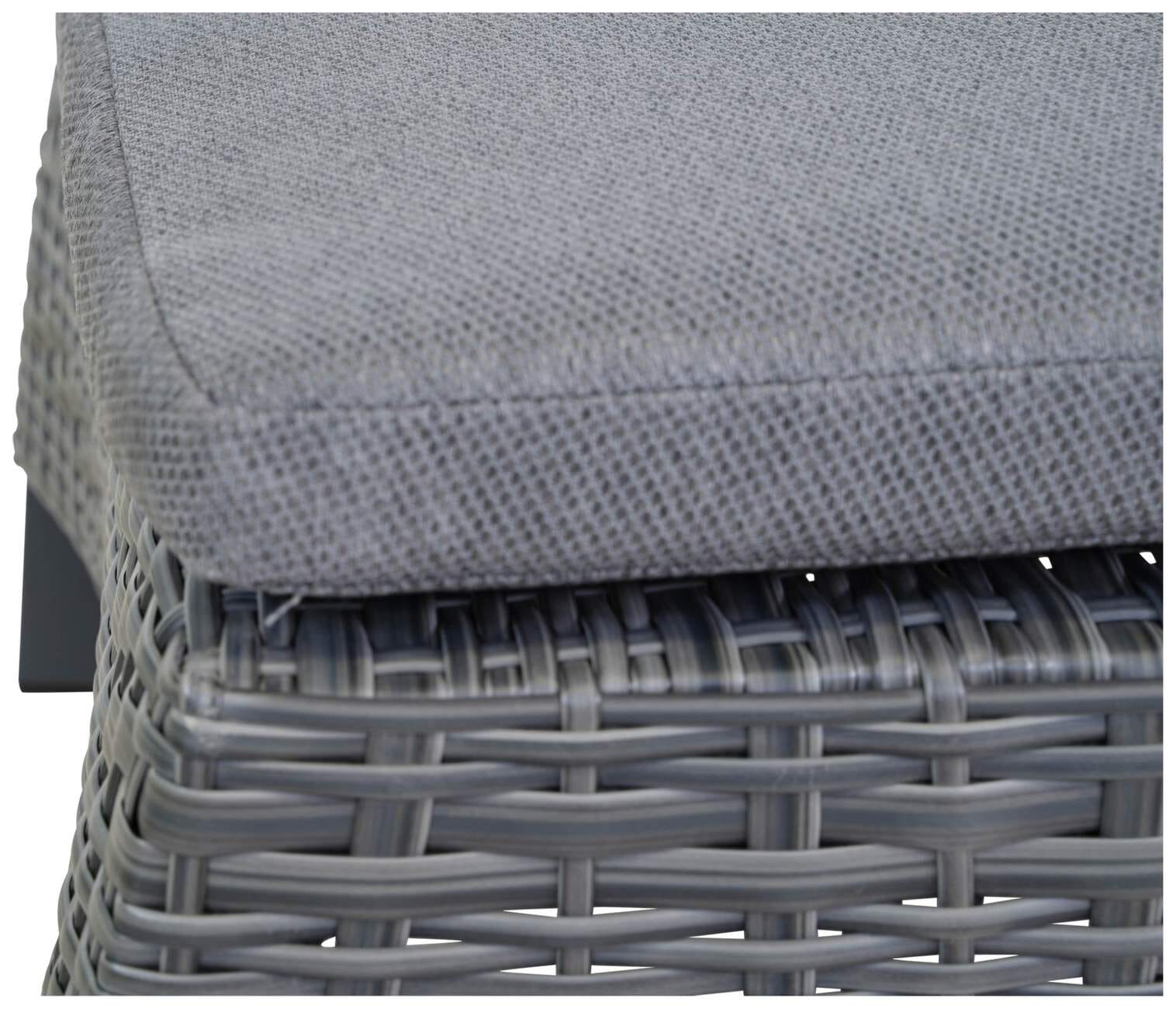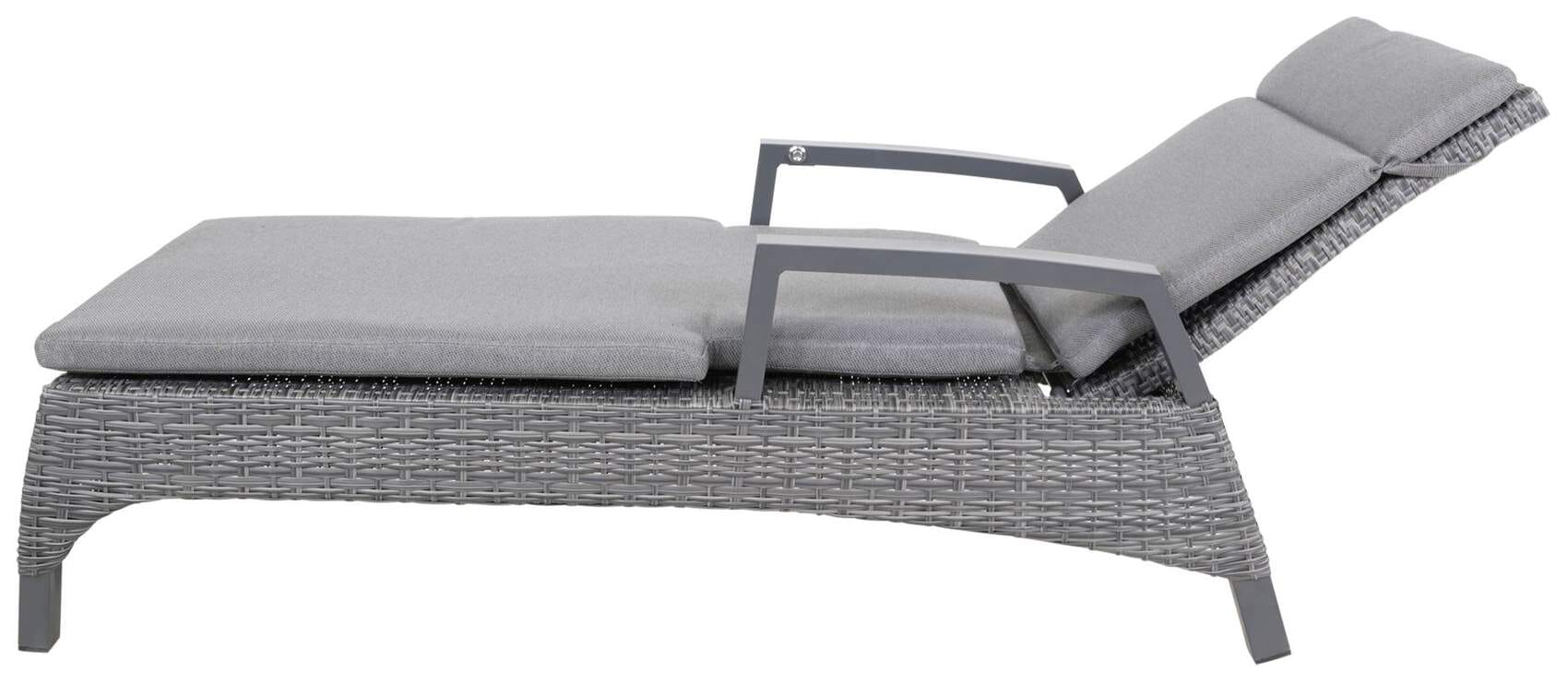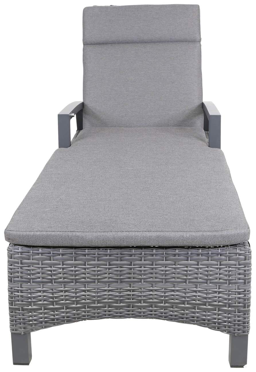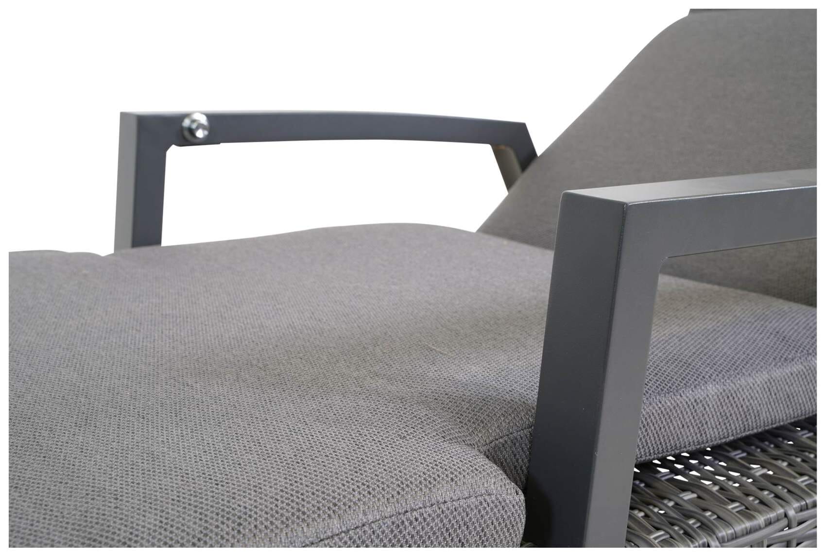 Das robuste mehrfach Aluminiumgestell der Sonnenliege ist in Grau lackiert und lässt sich dadurch mit klassischen und modernen Gartenmöbeln kombinieren. Die Liege ist mit einem wetterfesten Polyrattangeflecht bezogen, das eine bequeme Liege- und Sitzposition ermöglicht und gleichzeitig wasserabweisend ist.