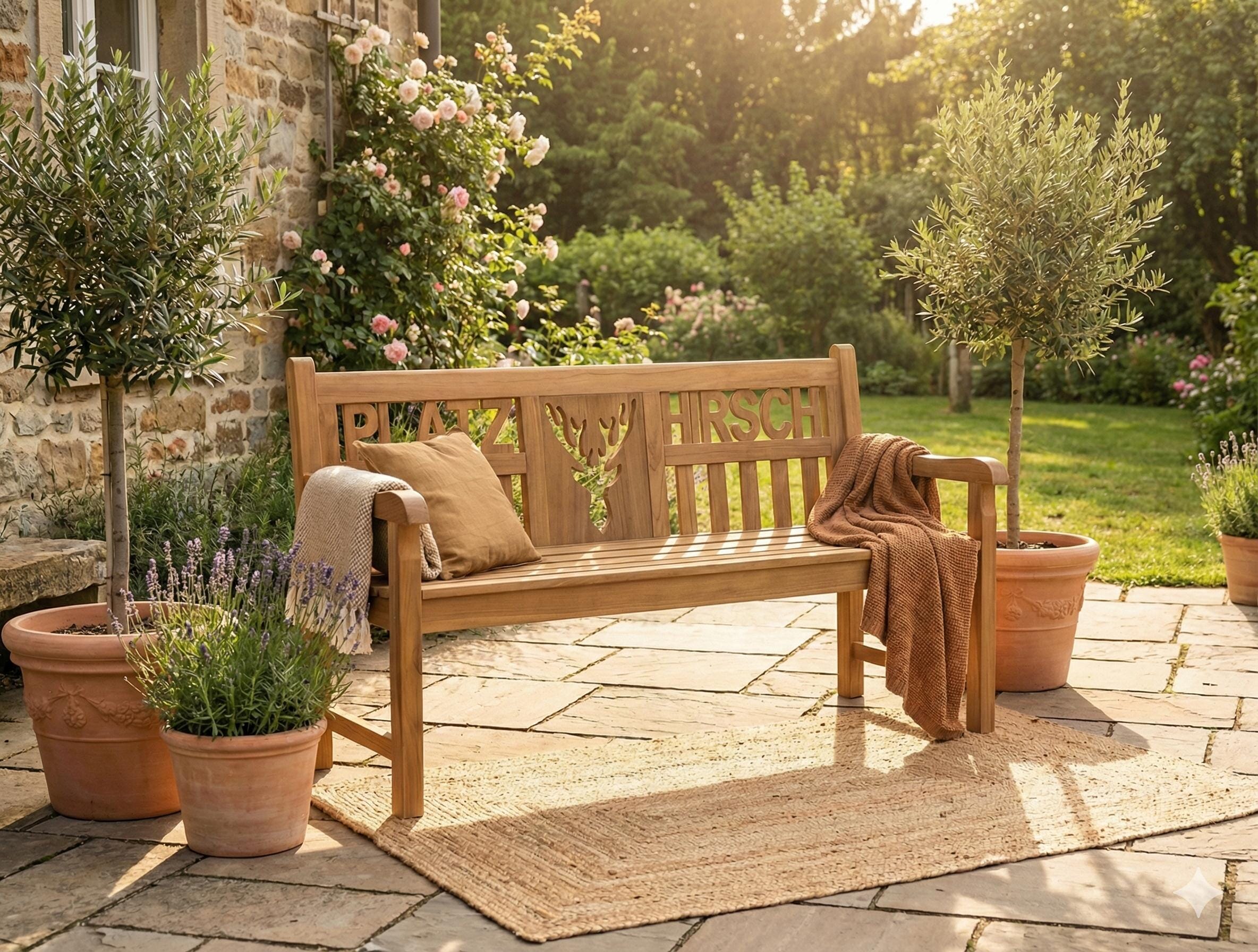 Machen Sie Ihren Garten zum Revier: Die Teak Gartenbank PLATZHIRSCH ist mehr als nur eine Sitzgelegenheit – sie ist eine Ansage. Mit dem markanten Schriftzug und dem kunstvoll ausgearbeiteten Hirsch-Motiv im Rückenteil wird diese Bank sofort zum unbestrittenen Blickfang auf jeder Terrasse.