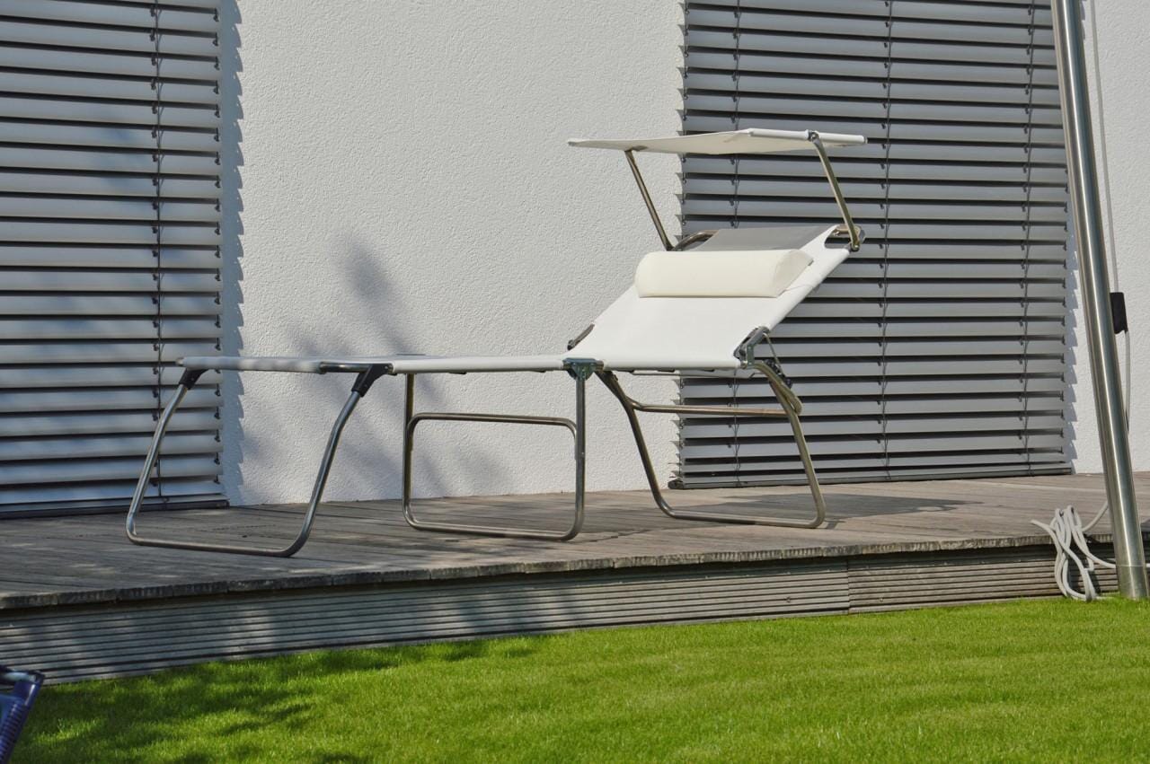 Zudem verfügt die Gartenliege über ein klappbares Sonnendach sowie eine passende Nackenrolle.