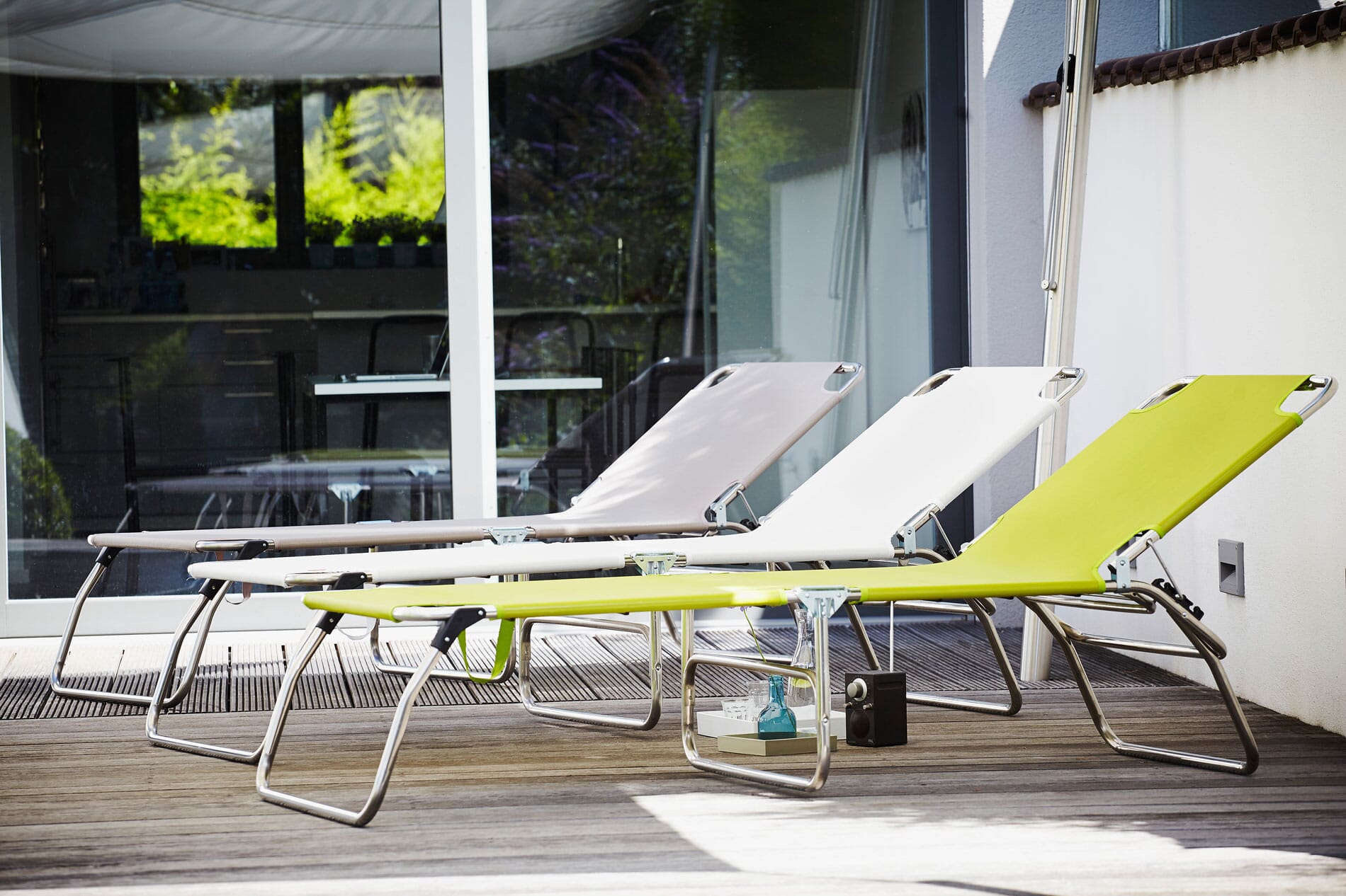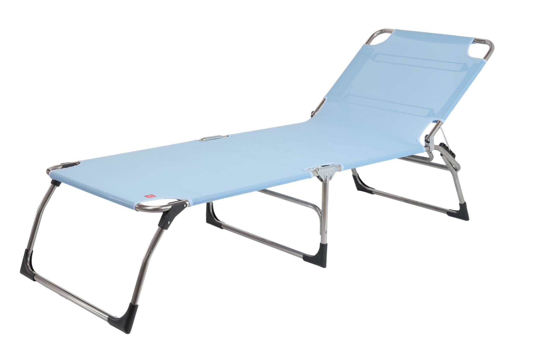 Das Kopfteil ist gleich drei Mal verstellbar, so dass alle gewünschten Aktivitäten möglich sind. Zum Gestell aus 25 mm Aluminiumrohr gesellt sich ein wunderbar leichter Bezug. Diese Liege lässt keinen Wunsch offen - auch keinen großen!