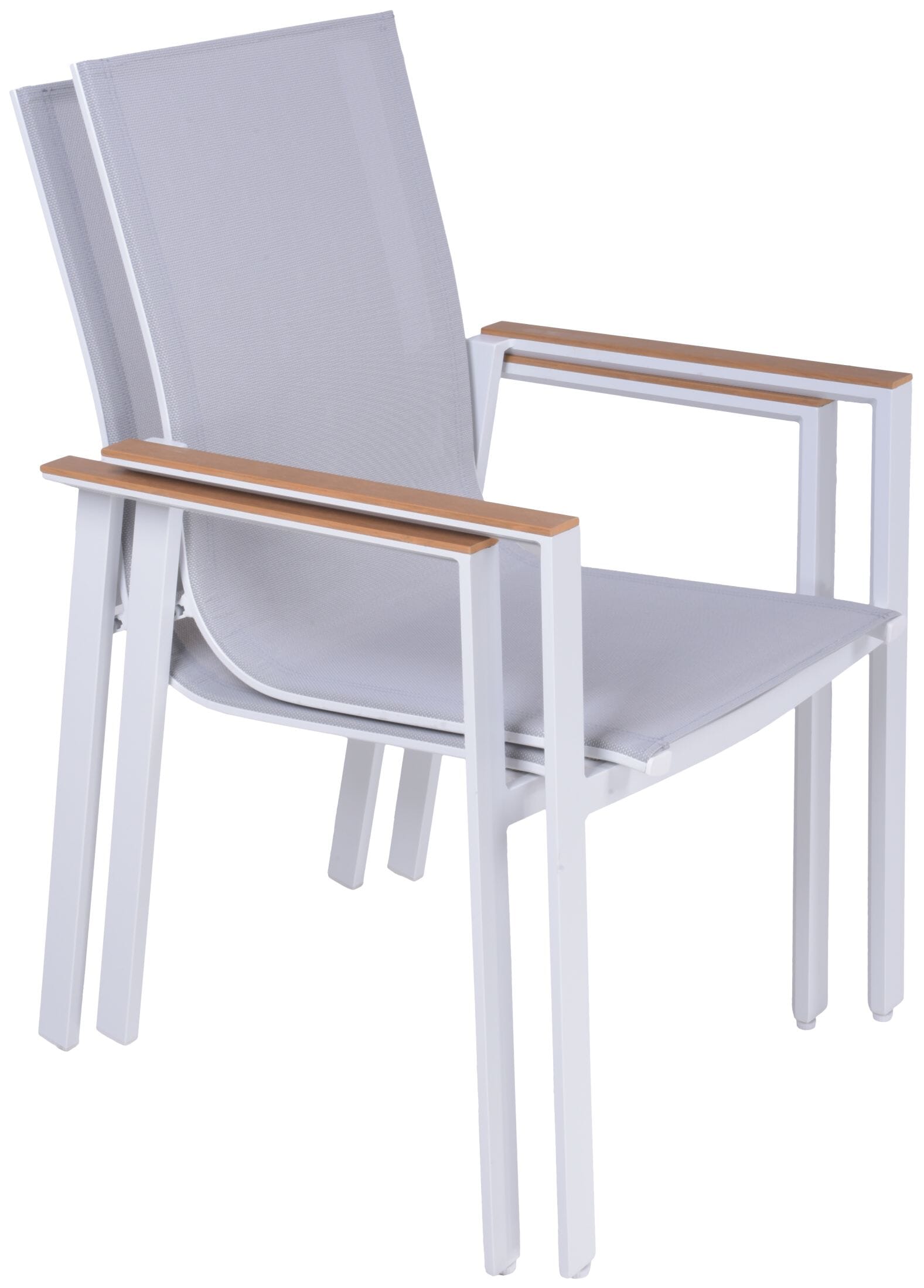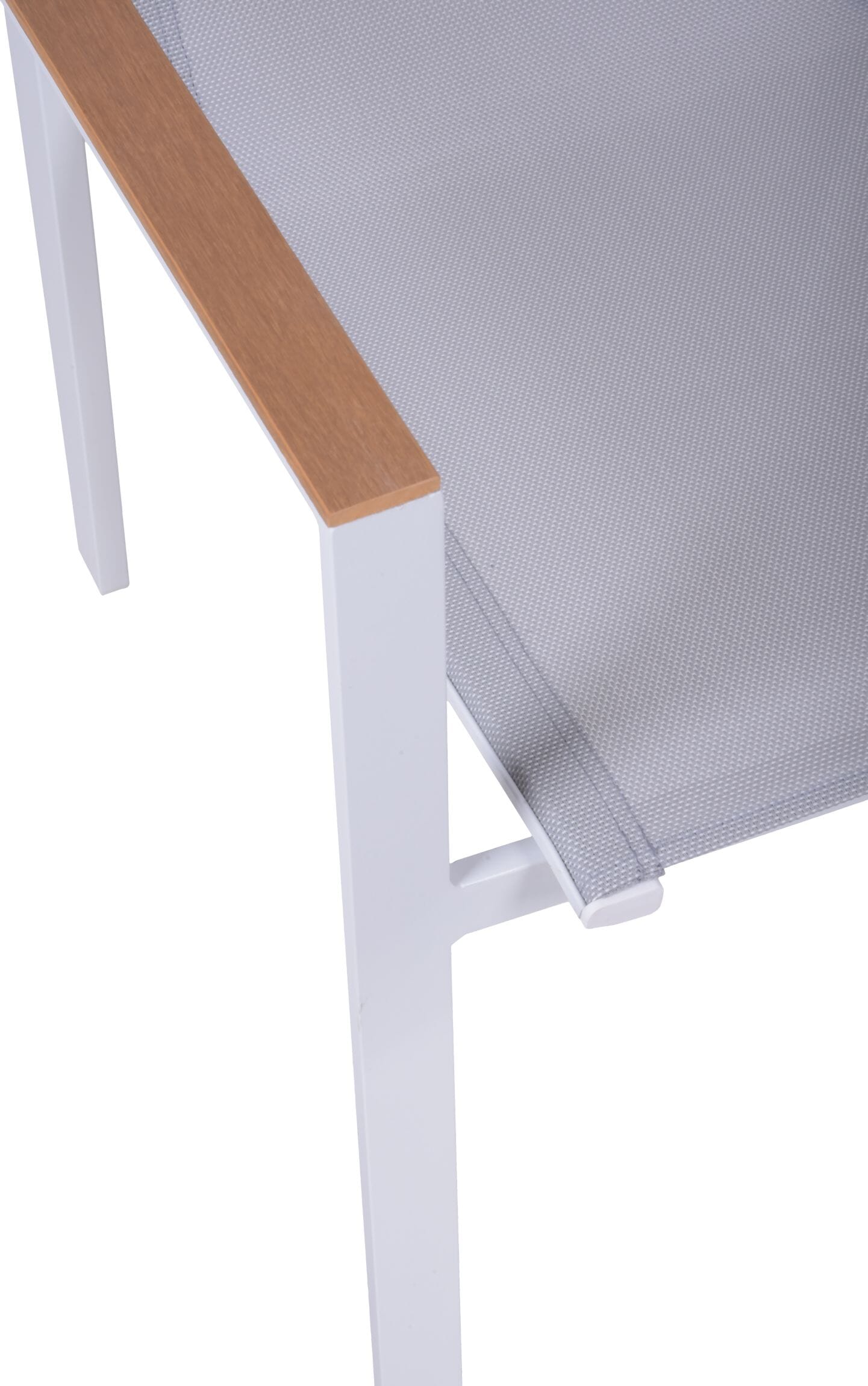 Die Armlehnen aus Nonwood in warmem Holzton setzen einen eleganten Kontrast zum weißen Stuhl und bieten zusätzlichen Komfort sowie eine natürliche Haptik.