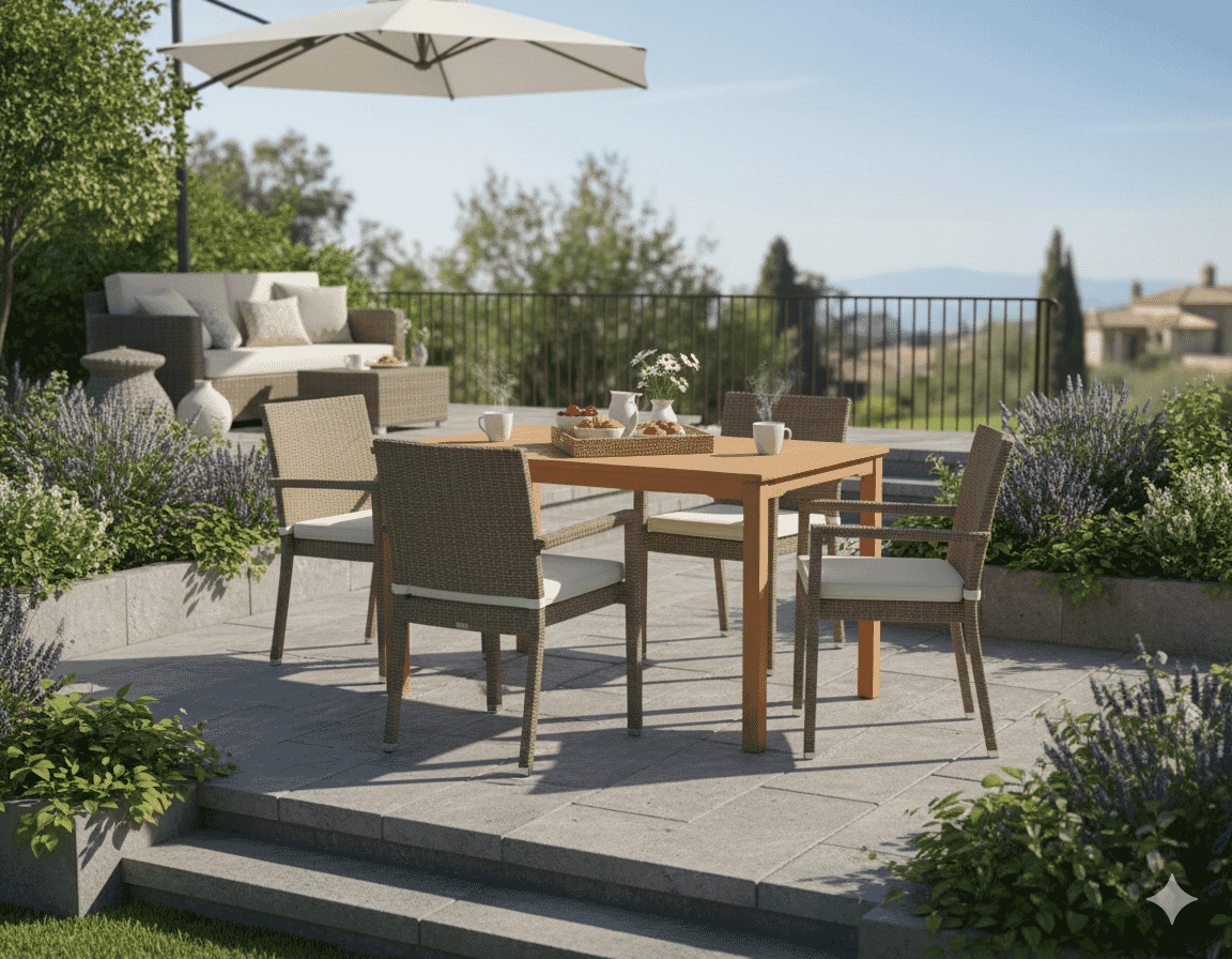 Unter der Sonne sind Alle milde gestimmt, und wenn dazu noch so ein Tisch mit ordentlich Platz für Tassen, Gläser, Teller, Schüsseln und Servietten zur Verfügung steht, kann nichts mehr die Laune trüben. Außer Wolken vielleicht.
