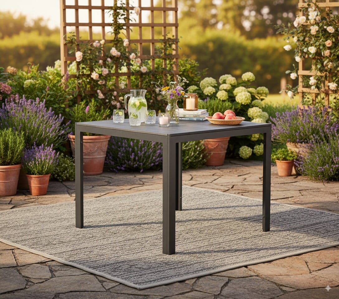 Der Tisch ist solide und witterungsbeständig verarbeitet und ideal für Haus, Garten oder Terrasse geeignet.
