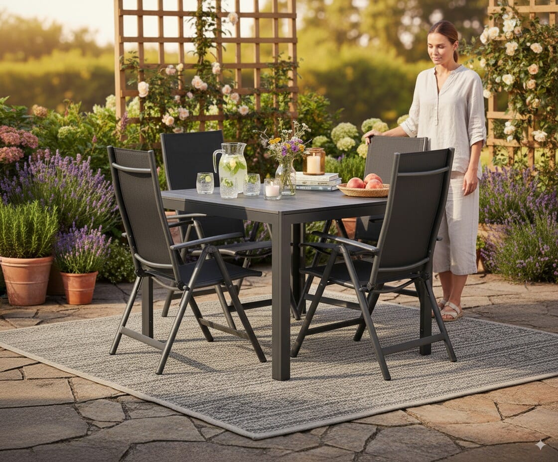 Der Gartentisch ist aus pflegeleichten pulverbeschichteten Aluminium und einer Nonwood Tischplatte in der Farbe Schwarz.