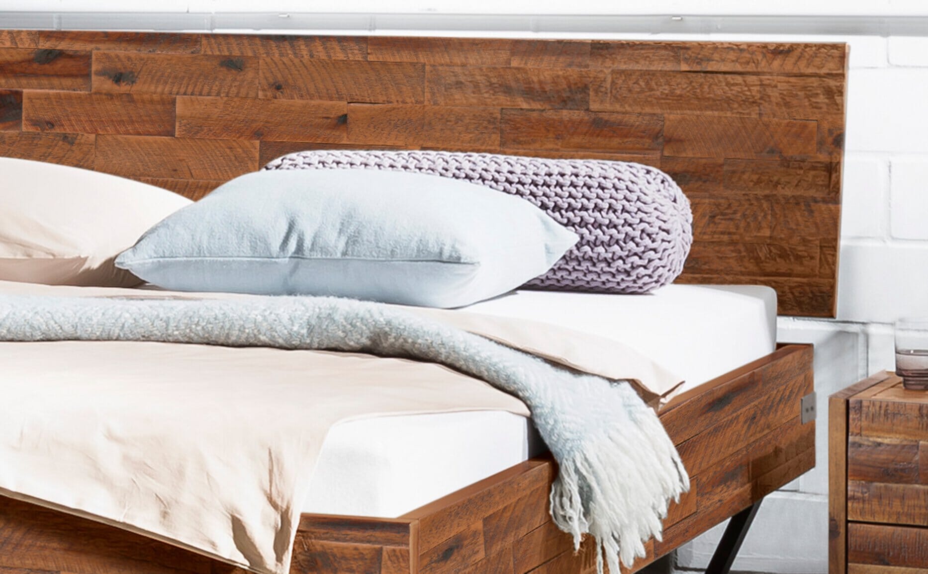 Metallene Kufen treffen auf stylisches Akazie-Massivholz. Unser Bett Ezzo verkörpert den puren Industriecharme. Die Beschläge unterstützen die Stabilität und machen den Look komplett.