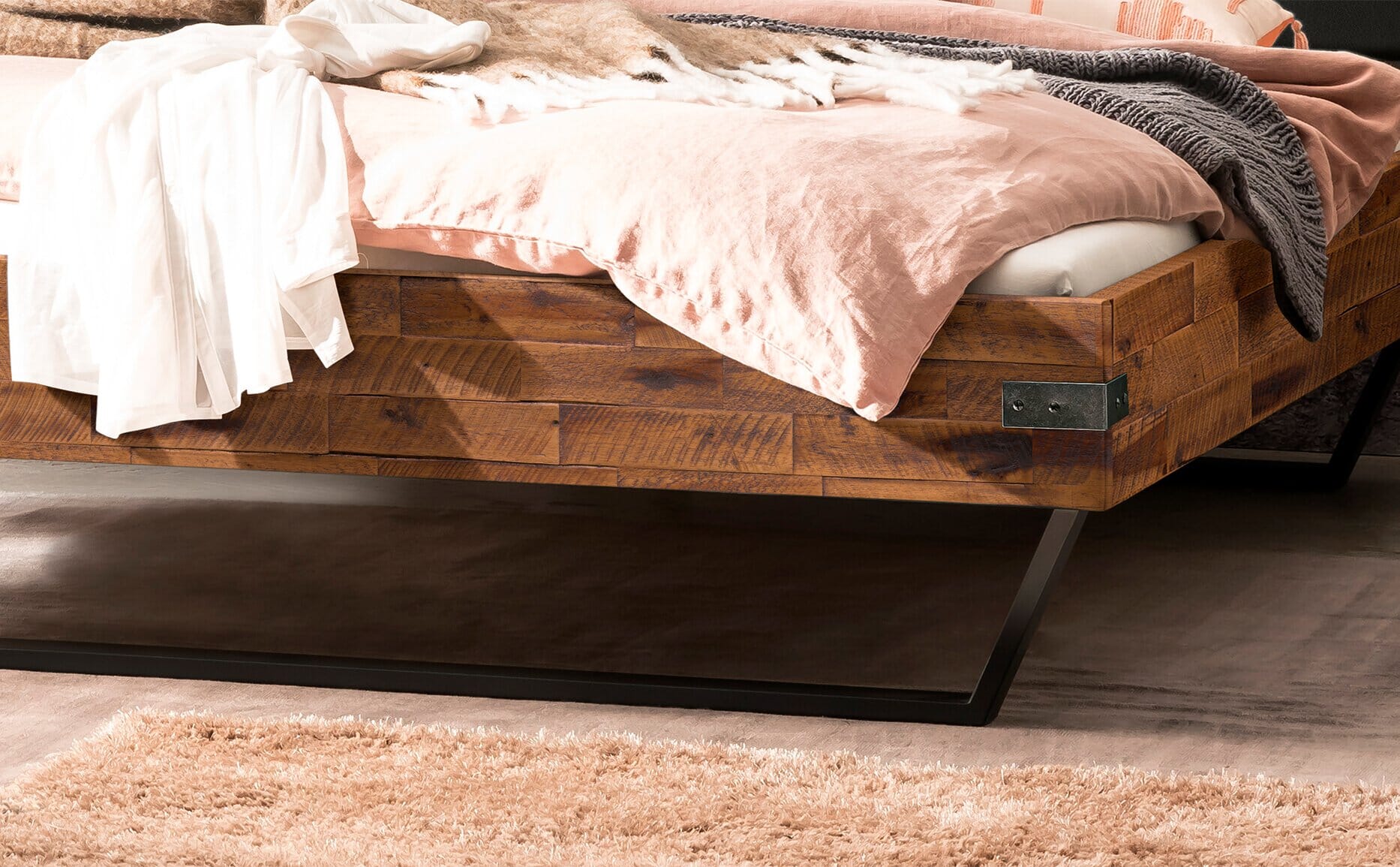 Dekorative Bolzen und natürliche Unregelmäßigkeiten – Das Bett San Luca im unkonventionellen Fabrikhallen-Stil taucht jedes Schlafzimmer in ein außergewöhnlich kosmopolitisches, urbanes Flair. Alle Holzteile werden aus massiver Akazie gefertigt, deren Robustheit die industrielle Anmutung des Bettes perfekt komplementiert.