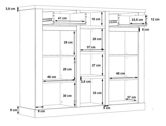 - Oberplatte: 38 mm, Plattenüberstand Oberplatte/Korpusseite ca. 17 mm