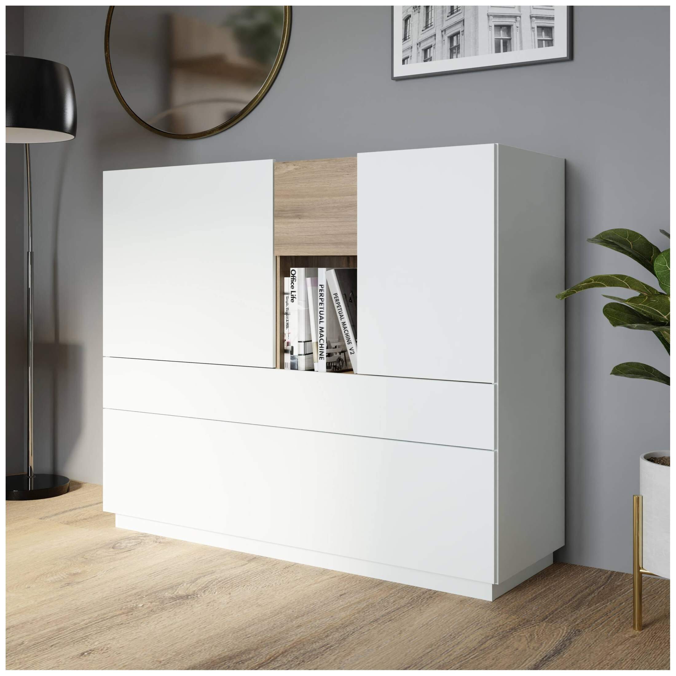 Zeitgemäß und äußerst interessant wirkt die Highboard LEWISVILLE . Während das schlichte, sehr helle Grau die moderne Note Ihres Wohnzimmers unterstützt, bringen Einsätze in naturnaher Valencia Eiche Wärme und Behaglichkeit ins Spiel. Die geradlinige Form dieses Highboards macht sie zu einem perfekten Begleiter.