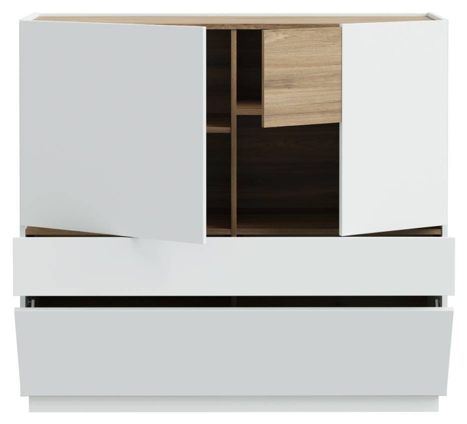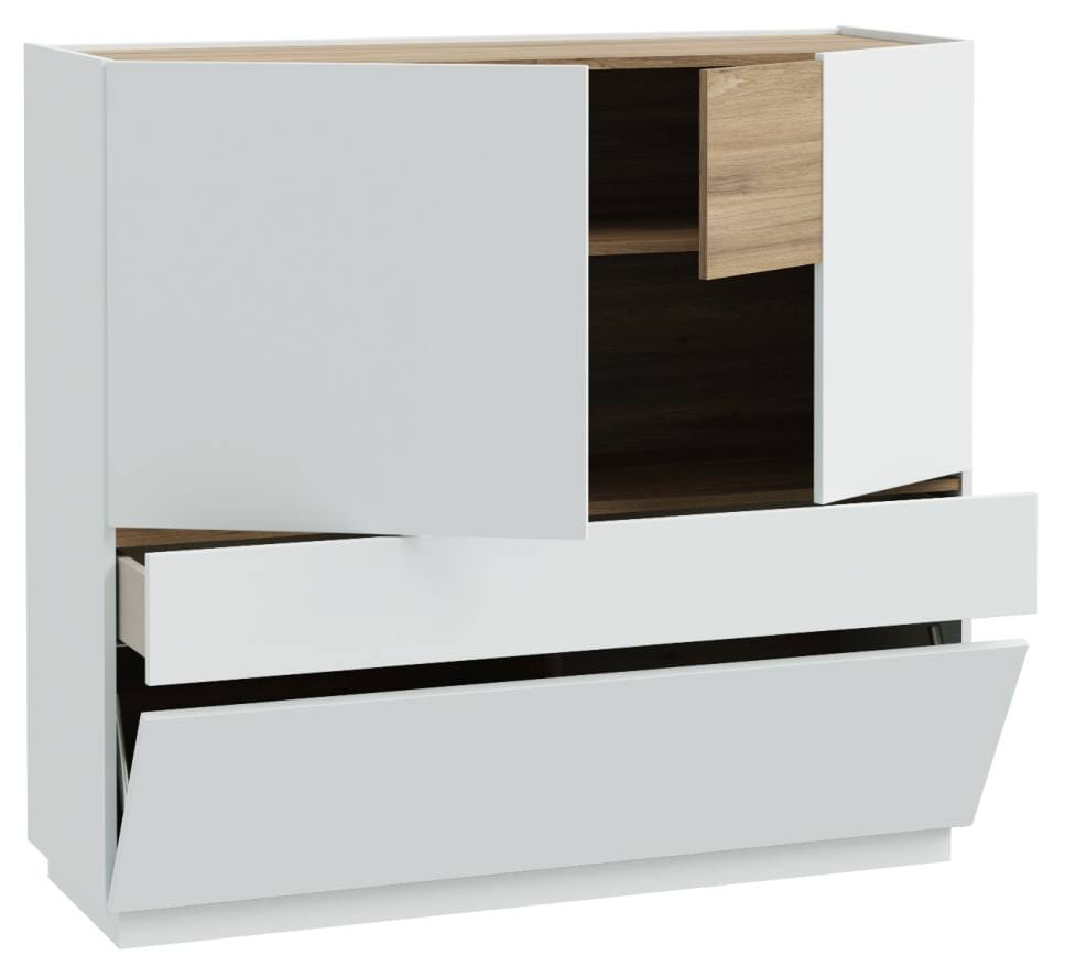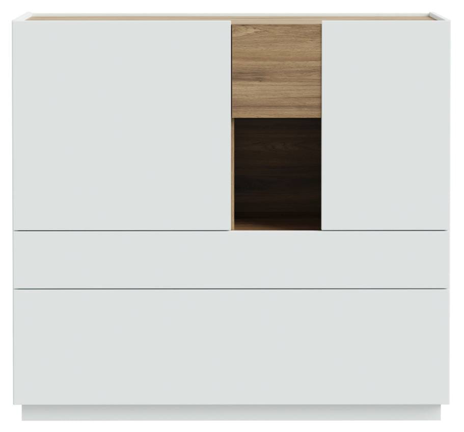 Die Option, alles unter zu bringen, was Sie schnell zur Hand haben möchten, verbinden sich hier auf schöne Weise. Hinter den beiden Türen, Schublade und Klappe hält das Highboard jede Menge Stauraum bereit. Soft-Close-Beschläge und die Push-To Open Funktion sorgen für ein komfortables Handling. Ganz ohne Möbelgriffe.
